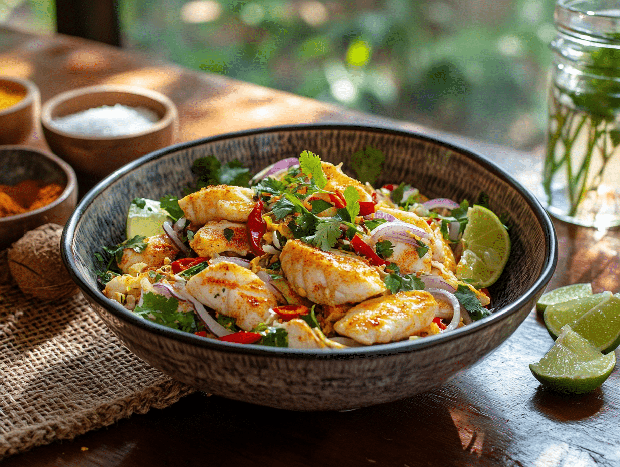 The spices and aromatics in Sri Lankan Fish and Coconut Salad reflect an intricate culinary heritage shaped by the island’s position along historic trade routes. Ingredients like black mustard seeds and green chilies bring a bold yet harmonious spice that is characteristic of South Asian flavors. Red onions add a mild pungency, while fresh lime juice provides acidity, balancing the richness of the ingredients. The addition of coriander leaves, a hallmark of Sri Lankan cooking, ties the dish together with a burst of herbal freshness.