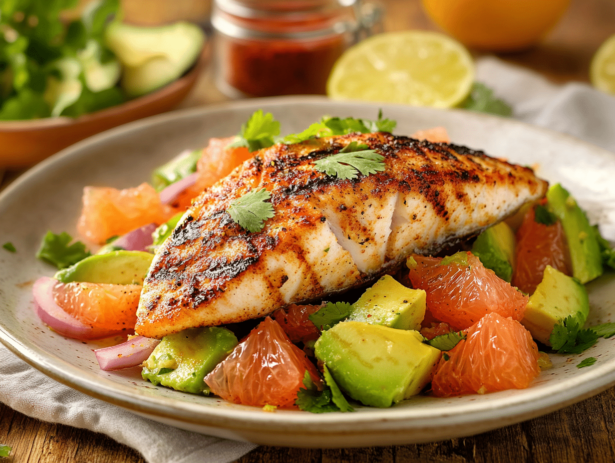 - Once the fish is ready, place a generous portion of the citrus salad on each serving plate and lay a grilled fish fillet on top.