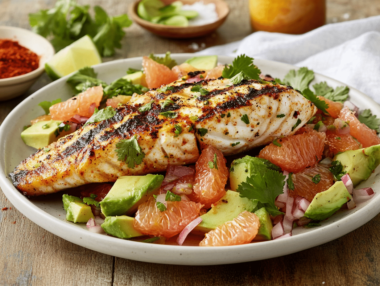 The use of citrus fruits in this dish reflects Ecuador’s tropical bounty. Citrus groves thrive throughout the country’s coastal lowlands and valleys, producing some of the freshest grapefruits, oranges, and limes. These fruits not only add bright, zesty acidity to the dish but also a touch of sweetness that complements the richness of the grilled fish. The citrus salad, featuring grapefruit and orange segments, is reminiscent of Ecuadorian “encebollado”, a traditional seafood soup often garnished with citrusy accents.
