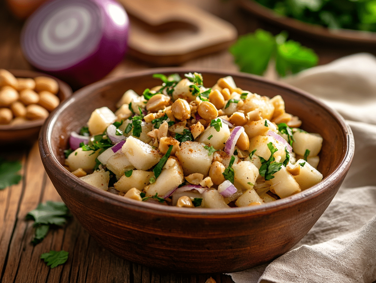 The Bolivian Yucca and Peanut Salad can be served as a “side dish” to complement grilled meats, or it can stand alone as a “light yet filling meal”. It is particularly enjoyable during warmer months when refreshing salads are preferred. Moreover, because yucca is naturally gluten-free, this dish is an excellent choice for those with dietary restrictions.