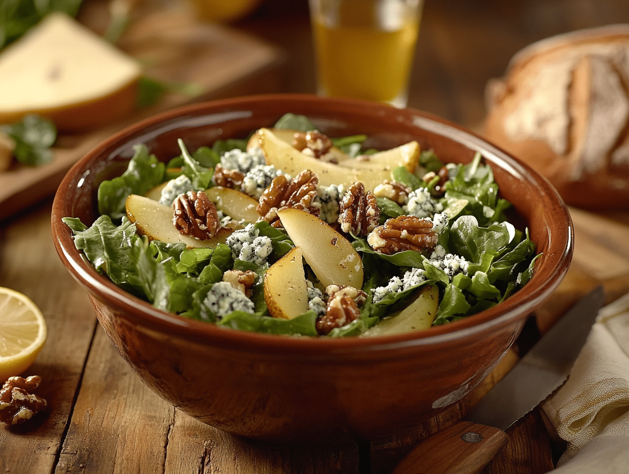 Gorgonzola, a traditional blue-veined cheese from Northern Italy, brings a robust and creamy note to the salad. Its tangy and salty profile balances the sweetness of the pears while complementing the nutty crunch of the candied walnuts. This cheese acts as the bridge that links the sweet and savory elements of the dish, transforming what’s typically considered a simple salad into an elevated experience.