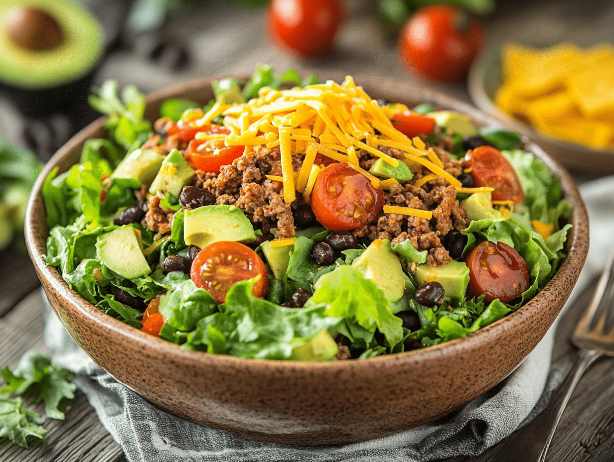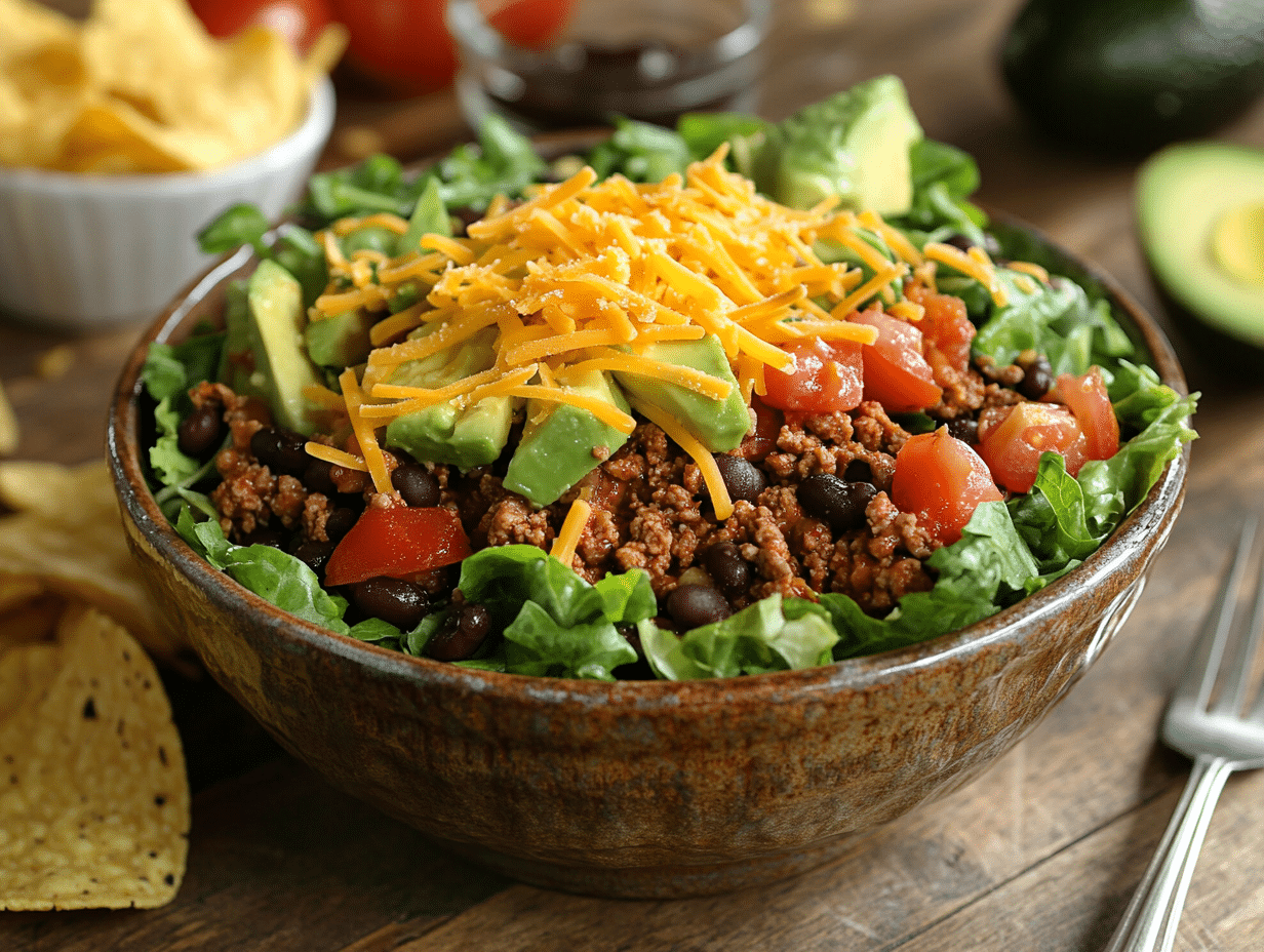 Our homemade version stays true to the spirit of the original while upgrading it with fresh, wholesome ingredients and a few modern twists. At its heart, this dish is equal parts comfort food and health-conscious meal: a medley of seasoned ground beef, black beans, and shredded cheddar cheese layered over crisp romaine lettuce and juicy cherry tomatoes. It’s crowned with creamy avocado slices and crunchy crushed tortilla chips—an irresistible combination of textures. The real magic, however, lies in the dressing: a simple yet zippy fusion of ranch and your favorite salsa. This tangy topping bridges the gap between creamy and spicy, offering a flavor-packed punch with each bite.