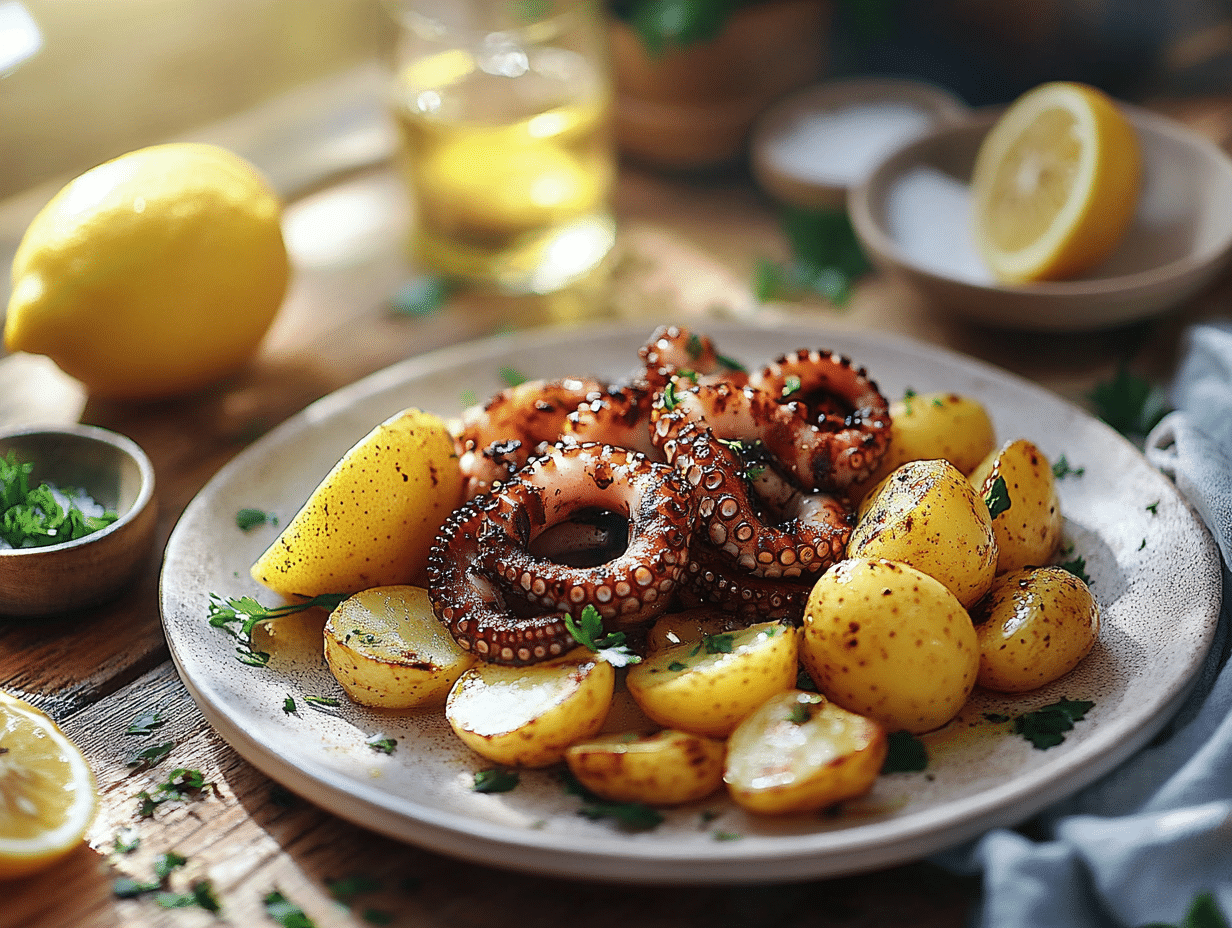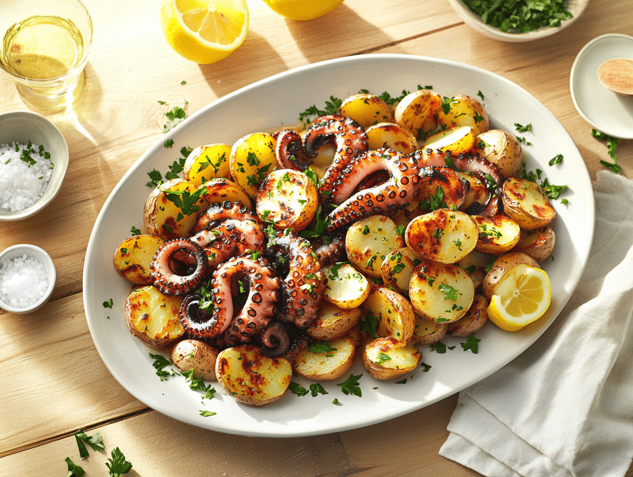 The Grilled Octopus and Potato Salad recipe is a delightful celebration of Mediterranean culinary traditions, fused with contemporary cooking techniques to create a dish that’s both satisfying and vibrant. This dish carries the essence of seaside locales, where fresh seafood and seasonal produce are combined to prepare meals that are simple yet deeply flavorful. The recipe is meant to transport you to the sunny shores of Greece, the Amalfi Coast of Italy, or the bustling markets of Spain—all of which hold octopus in high regard in their cuisines.