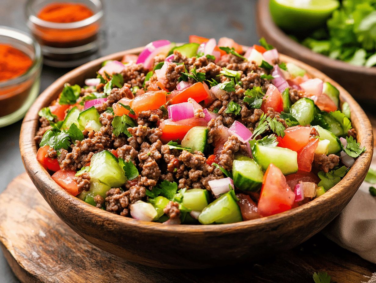 In this recipe, the rich flavors and core ingredients of soyo remain, but the method of preparation shifts to create a fresh, vibrant dish. Instead of simmering the ingredients into a soup, the ground beef is cooked with aromatic seasonings like cumin, smoked paprika, garlic, and black pepper. This imparts depth and warmth to the dish while maintaining the familiar taste of soyo.