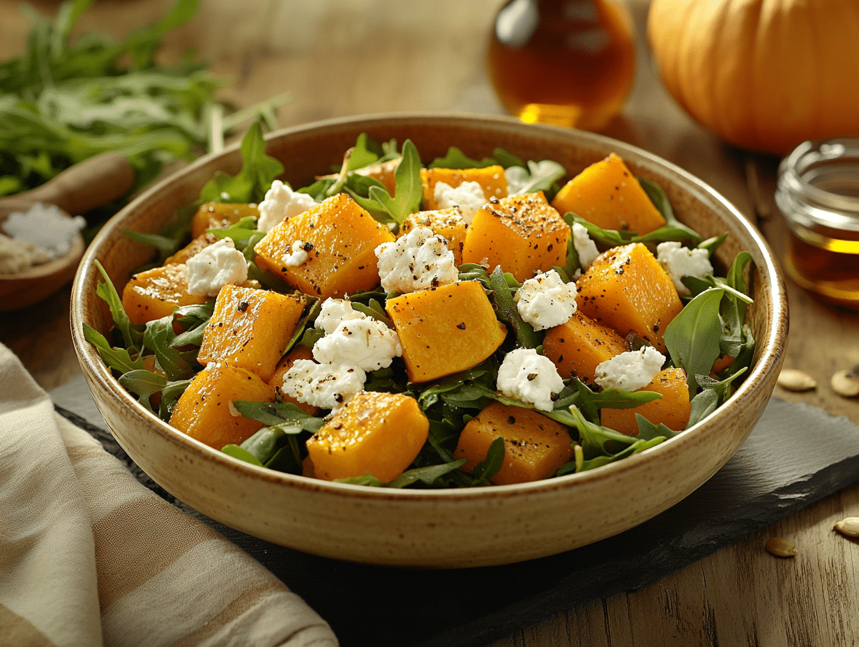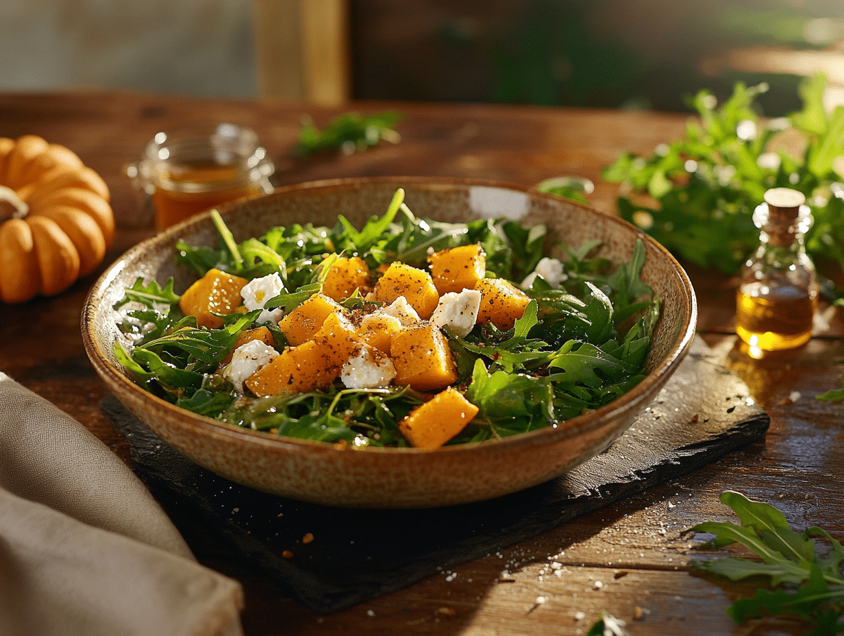 - Assemble the salad: In a large salad bowl, combine the roasted pumpkin, arugula, and crumbled goat cheese. Drizzle with the prepared dressing and gently toss until everything is well coated.