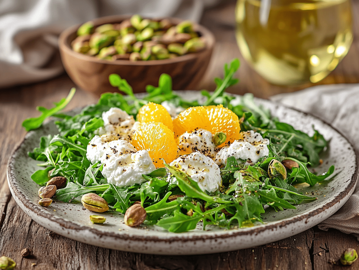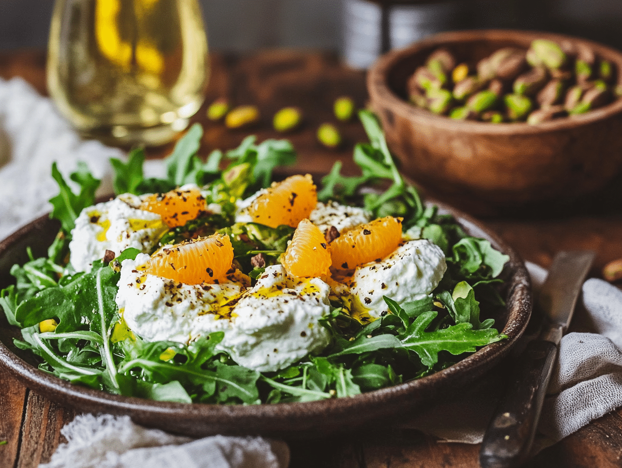 At the heart of this dish is ricotta, a soft and creamy cheese that has been a cornerstone of Sicilian kitchens for generations. Sicilian ricotta, often made from sheep’s milk, has a particularly delicate sweetness and luscious texture, which elevates the subtle flavors of this salad. Traditionally, ricotta is used in both sweet and savory dishes, from ricotta-stuffed cannoli to ricotta-rich pasta sauces. Here, it lends a creamy contrast to the freshness of arugula and the crunch of pistachios.