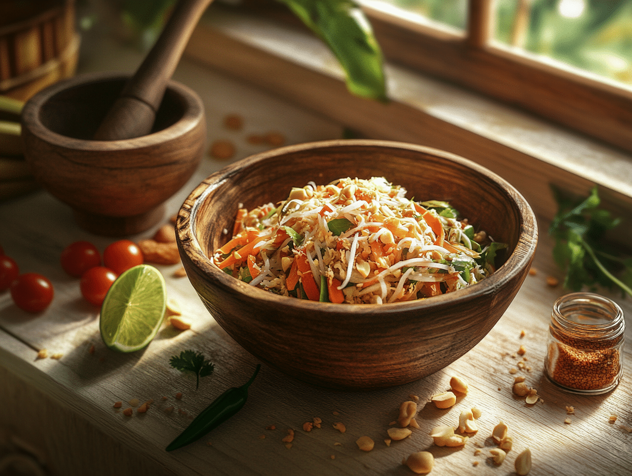 Som Tam, also known as Thai Green Papaya Salad, is one of the most beloved and iconic dishes in Thai cuisine. Its delicate harmony of bold flavors—spicy, tangy, salty, and sweet—not only delights the palate but also embodies the quintessential principles of Thai gastronomy. Originating in the northeastern region of Thailand, often referred to as Isaan, this dish has transcended regional boundaries to become a global favorite, celebrated for its freshness and vibrancy.