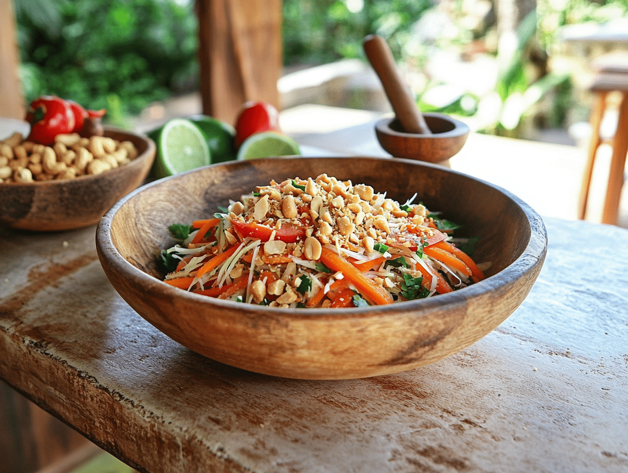 The “magic” of Som Tam lies in its robust dressing, crafted using a mortar and pestle—a traditional Thai kitchen tool that allows the ingredients to be pounded and combined, infusing their flavors together thoroughly. Fresh garlic and fiery green chili form the base, which is sweetened with grated palm sugar, balanced with tart lime juice, and enhanced by the bold umami of fish sauce. This fragrant, tangy mixture serves as the soul of the salad, tying together all its components for a bold yet balanced flavor profile.