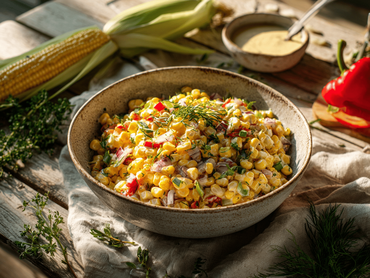 Classic creamy corn salads have their roots in Depression-era cookery, where ingredients like mayonnaise—once a luxury—became pantry staples, and convenience met creativity on the plate. At the time, corn was often canned, and the “creamy” component was sometimes as simple as a dollop of mayo mixed with vinegar and sugar. But as access to fresh ingredients increased, home cooks embraced the natural sweetness and textural appeal of fresh corn, pairing it with garden herbs and crisp raw vegetables like celery and bell pepper for contrast. This recipe honors that evolution.