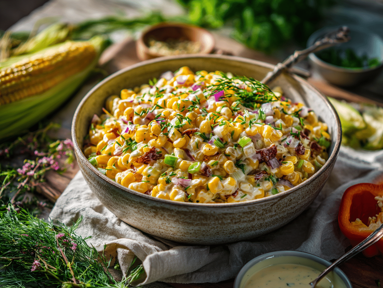 But at the heart of it all, Classic Creamy Corn Salad with Mayo and Herbs is a love letter to heritage recipes: dishes passed down through generations, adapted with care, and designed not just to nourish, but to charm. Whether served in a chilled ceramic bowl beneath a shady oak tree, or plated indoors beside grilled meats and fresh rolls, it carries the soul of American summer—one bite of crisp corn, creamy dressing, and bright herbs at a time.
