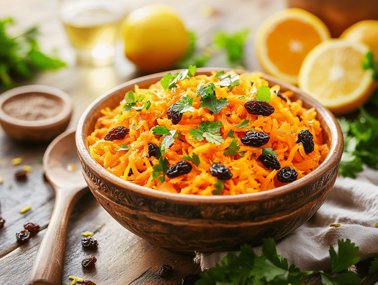 One of the reasons this salad is so popular is its nutritional benefits. Carrots are rich in beta-carotene, which converts to vitamin A in the body and aids in vision and immune function. They also provide dietary fiber, supporting digestion. Raisins contribute natural sugars, iron, and antioxidants, while citrus juices in the dressing offer an extra dose of vitamin C, which boosts immunity. The olive oil in the recipe brings healthy fats, and cumin not only adds depth to the flavor but is also known for its digestive benefits.