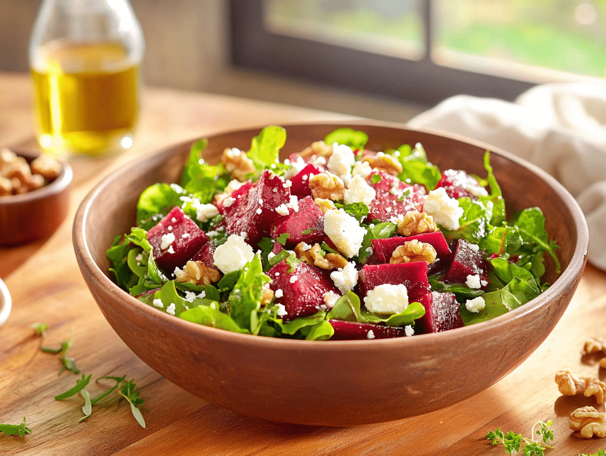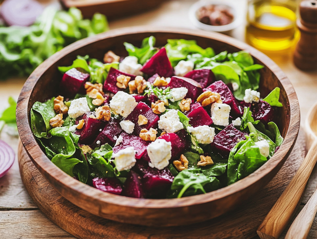 Beyond being delicious, this salad is packed with nutritional benefits. Beets are rich in antioxidants, fiber, and nitrates, which can help improve blood circulation and reduce inflammation. Leafy greens like arugula, spinach, and baby kale contribute essential vitamins and minerals, while walnuts add heart-healthy omega-3 fatty acids. Feta cheese provides calcium and protein while keeping the dish relatively light. The olive oil in the vinaigrette further enhances the heart-healthy qualities, making this salad an excellent choice for those looking for a nutritious, well-rounded meal.