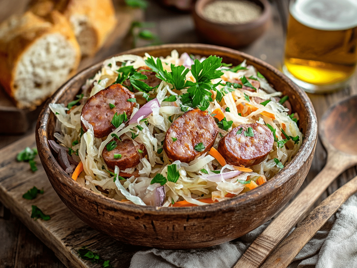 Beyond its delicious taste, this salad is also packed with health benefits. Sauerkraut is rich in probiotics, improving gut health and digestion, while smoked sausage provides protein and deep umami flavors. The inclusion of fresh vegetables adds essential vitamins, fiber, and antioxidants, making this dish as nutritious as it is flavorful.