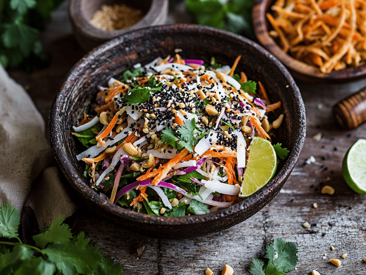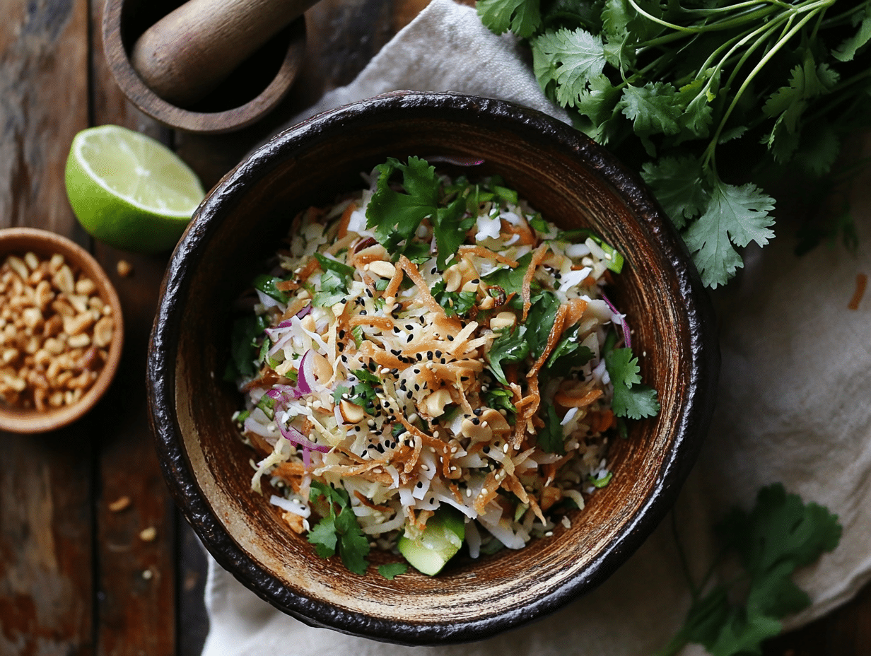 The Burmese Black Sesame and Coconut Salad is a vibrant embodiment of Myanmarโs rich culinary heritage, rooted in centuries of regional flavor traditions and social customs around food. It belongs to a broader family of dishes known as thoke (pronounced โthohโ), which refers to the wide array of Burmese salads made from raw or lightly cooked vegetables, pulses, noodles, and proteins, tossed in a lively combination of oils, citrus, nuts, spices, and sometimes fermented elements for complexity. Thoke is more than just a dish โ itโs a testament to the Burmese cultural philosophy of balance and harmony in taste.