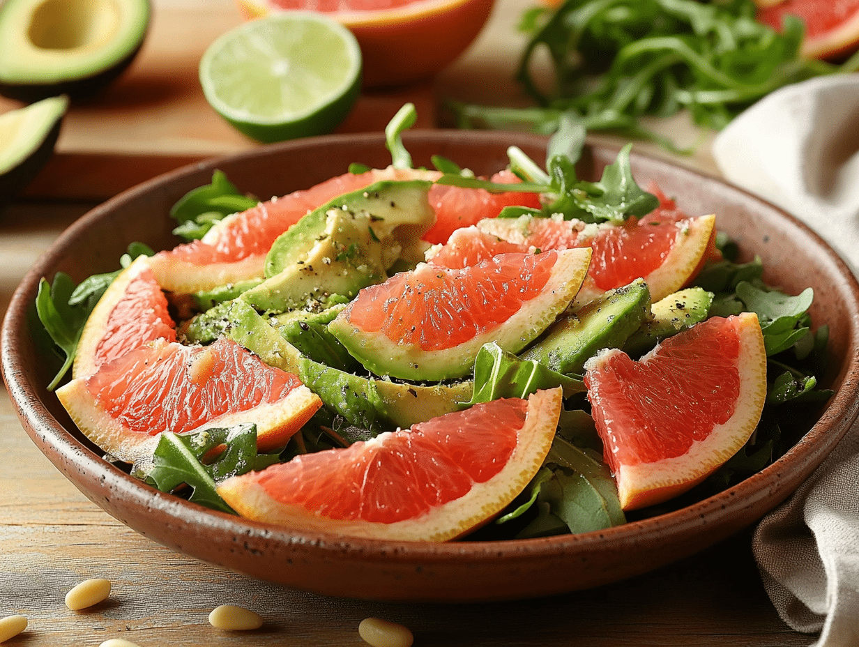 Each ingredient in this salad contributes to a healthful and nourishing meal. Avocados are packed with monounsaturated fats, which promote heart health and provide lasting satiety. They’re also rich in fiber, potassium, and vitamins like folate and vitamin E. Grapefruit, on the other hand, is an excellent source of vitamin C, known for its immune-boosting properties, and antioxidants that help protect the body from oxidative stress.