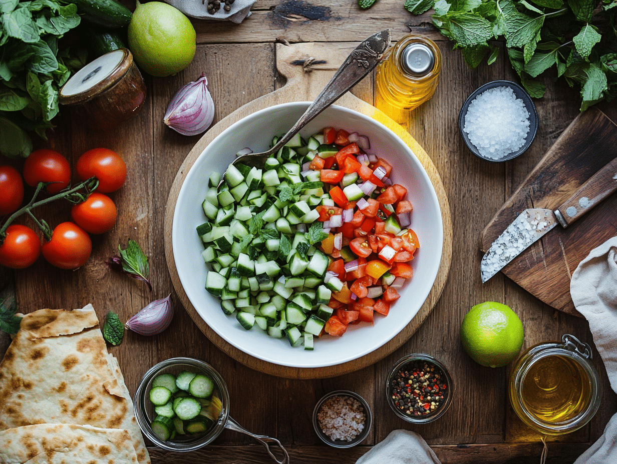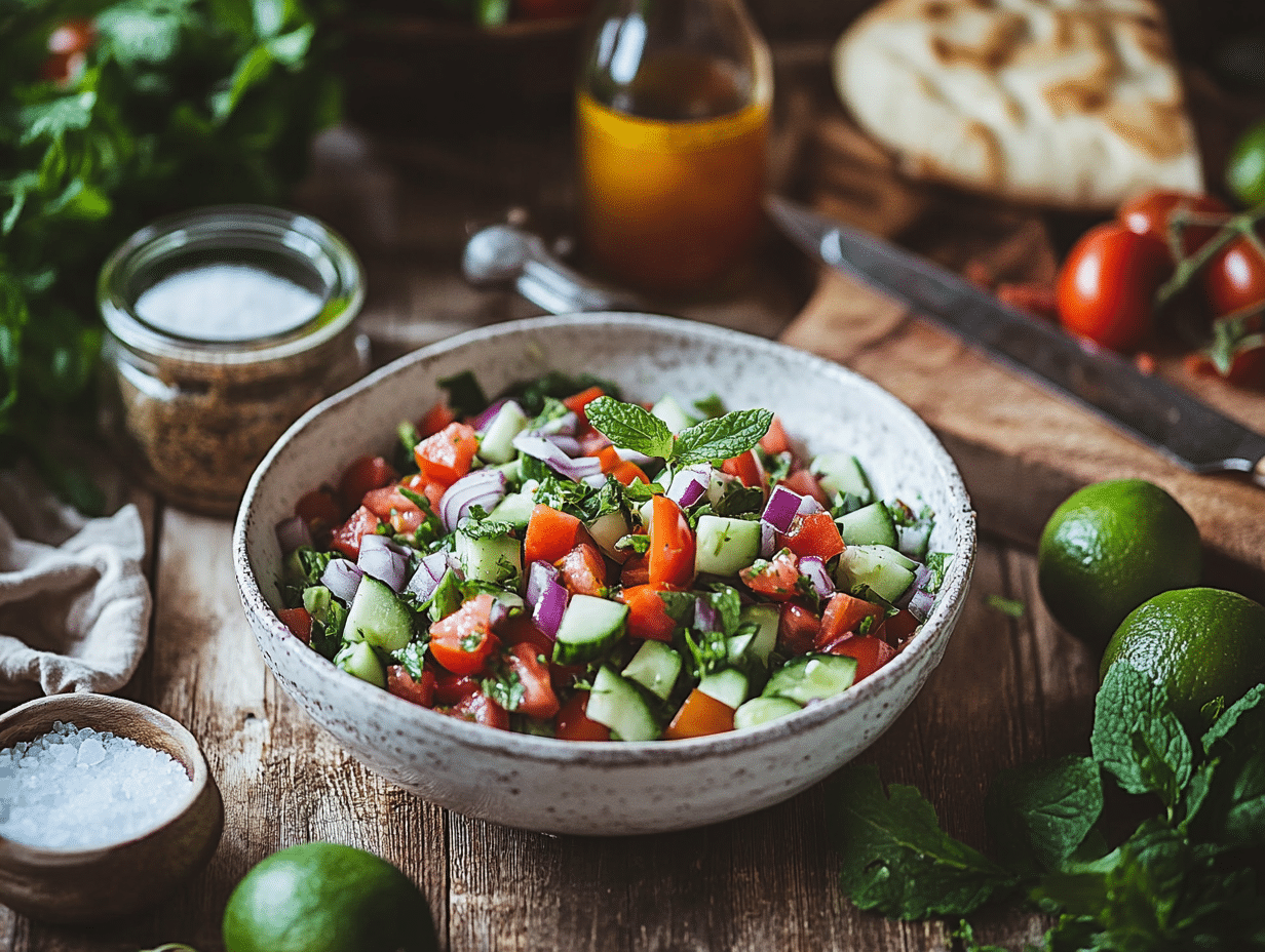 The salad’s primary ingredients—Persian cucumbers, heirloom tomatoes, and red onion—are chosen for their texture and flavor balance. Persian cucumbers are crisp and seedless, perfect for a light and clean crunch, while heirloom tomatoes contribute a sweet-tart burst of juicy flavor. The red onion adds a hint of sharpness, beautifully offsetting the other fresh components. Finely chopped fresh mint leaves are a hallmark of Shirazi Salad, providing an aromatic, cooling contrast that elevates its taste to something truly special.