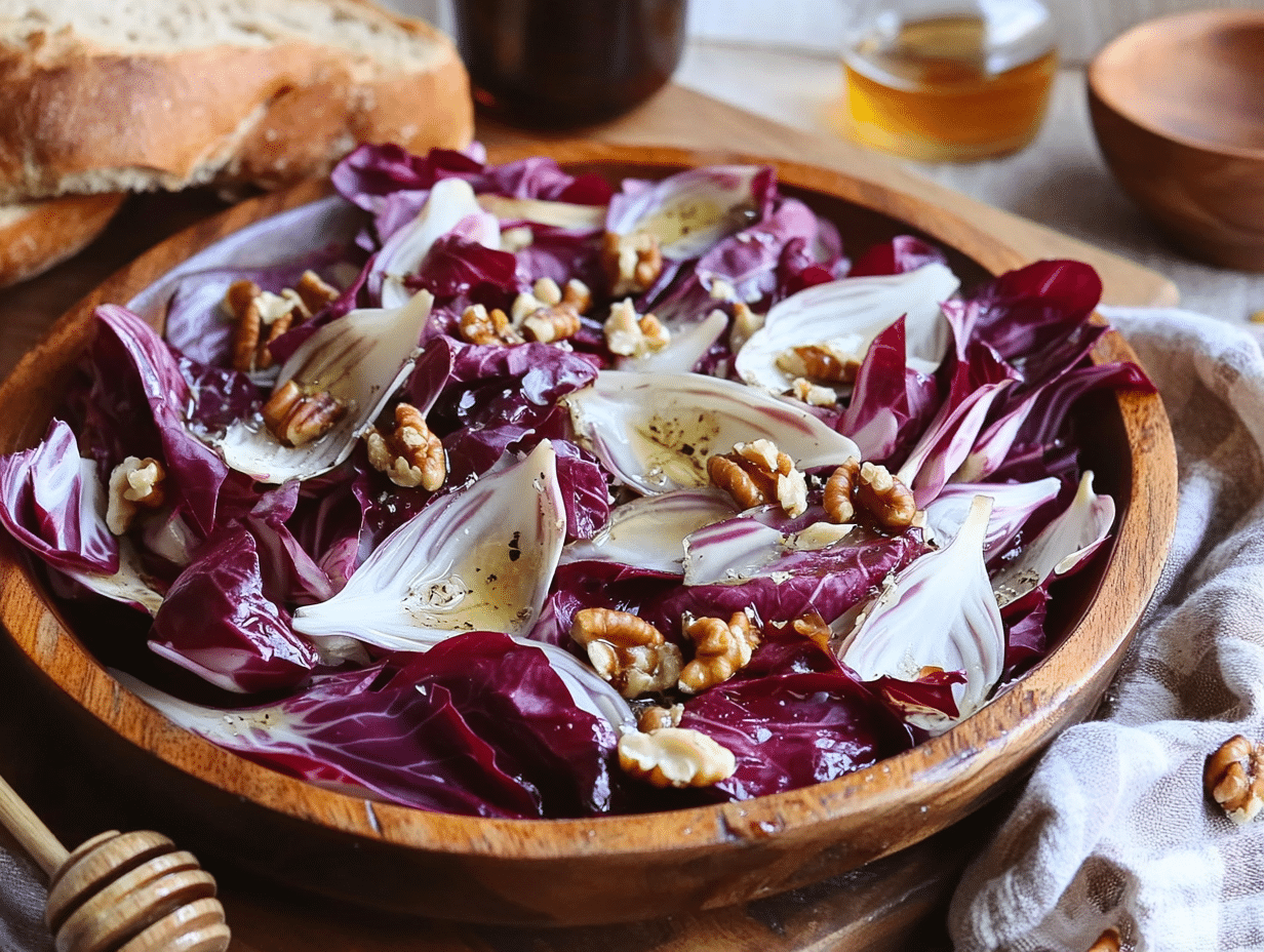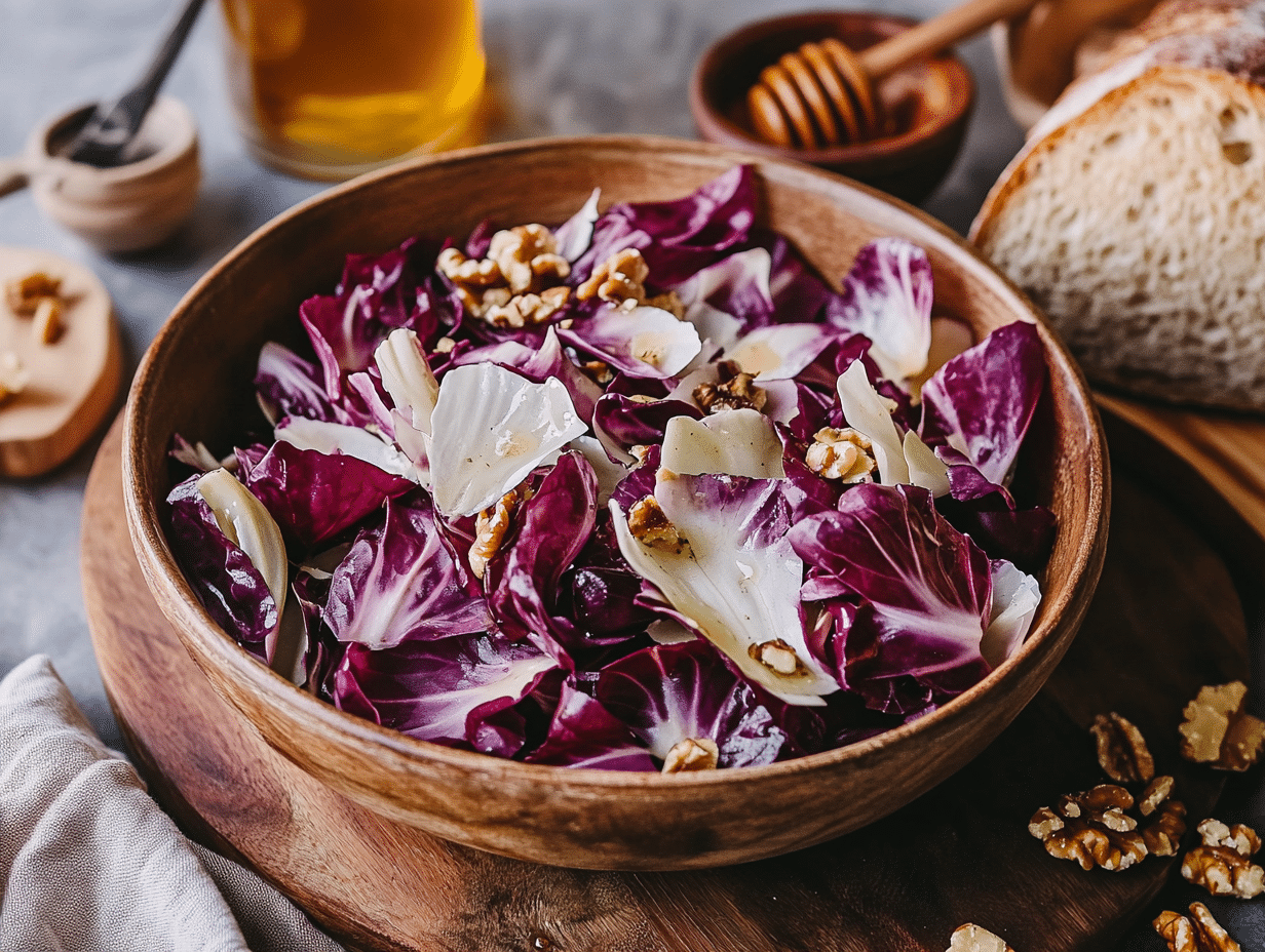 The Radicchio and Endive Salad with Walnut Vinaigrette is an exquisite tribute to the culinary traditions of Northern Italy, where bitter greens are cherished for their remarkable depth of flavor and ability to complement rich ingredients. This salad is more than just a mélange of greens—it is a celebration of contrast, balance, and elegance.
