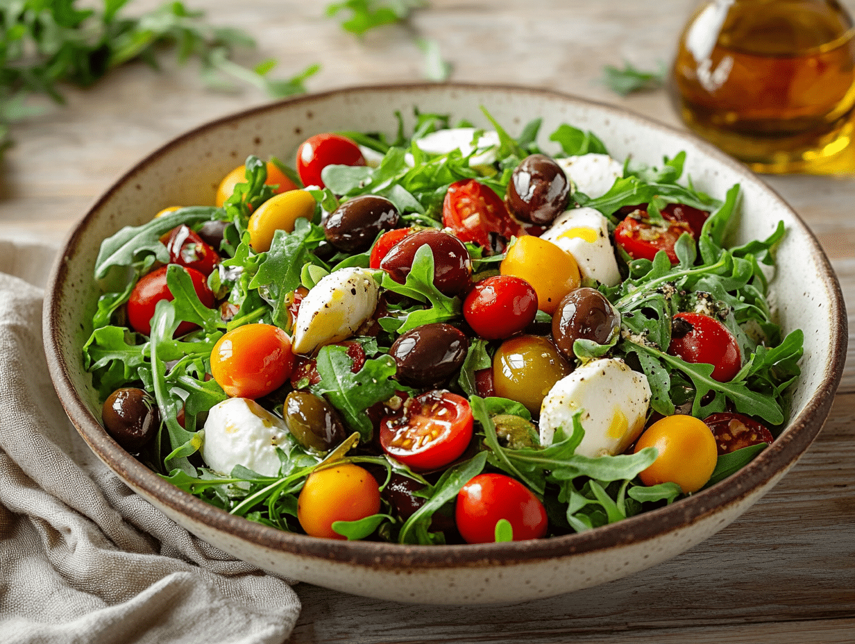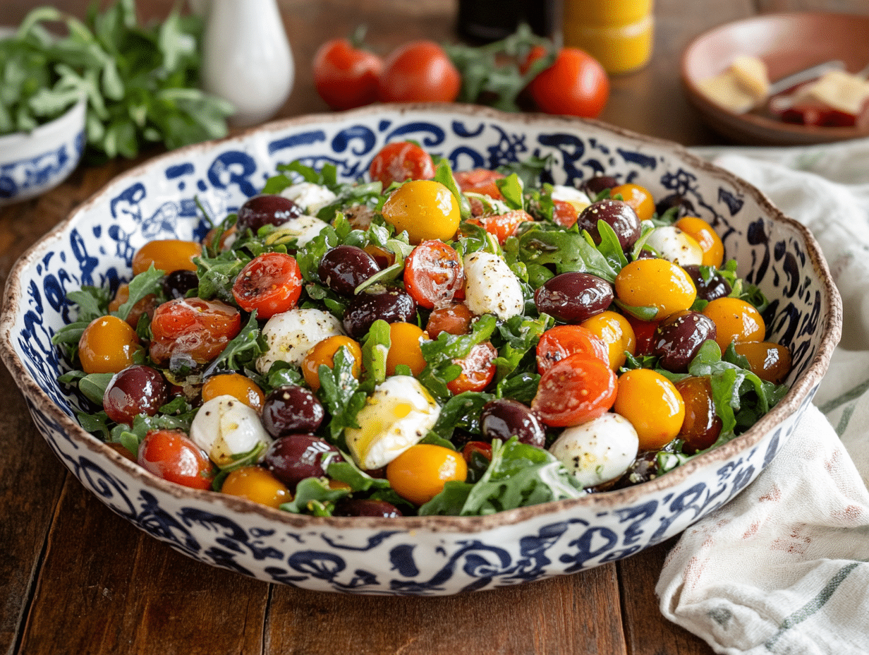 - In a large mixing bowl, combine the halved cherry tomatoes, pitted Marche-style olives, and arugula. Gently toss to evenly distribute the ingredients.