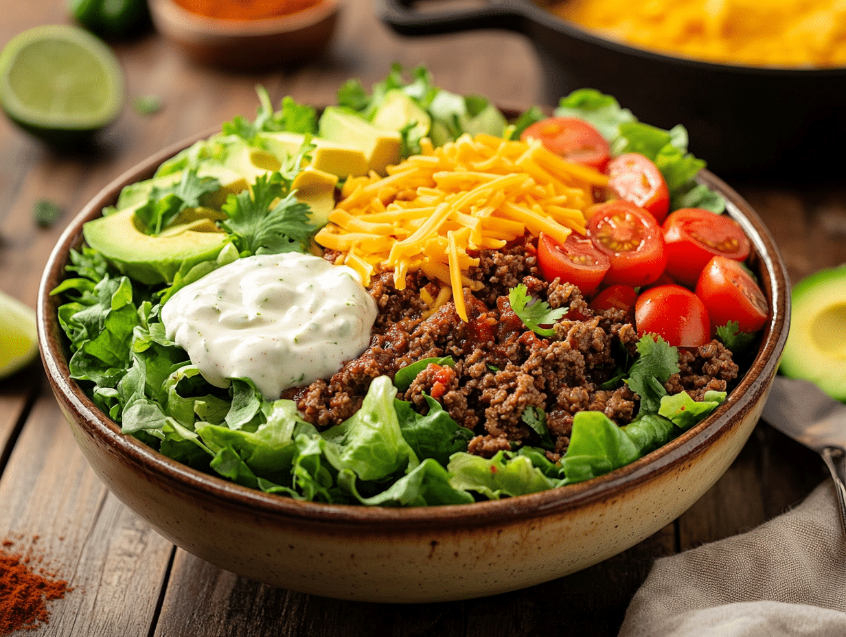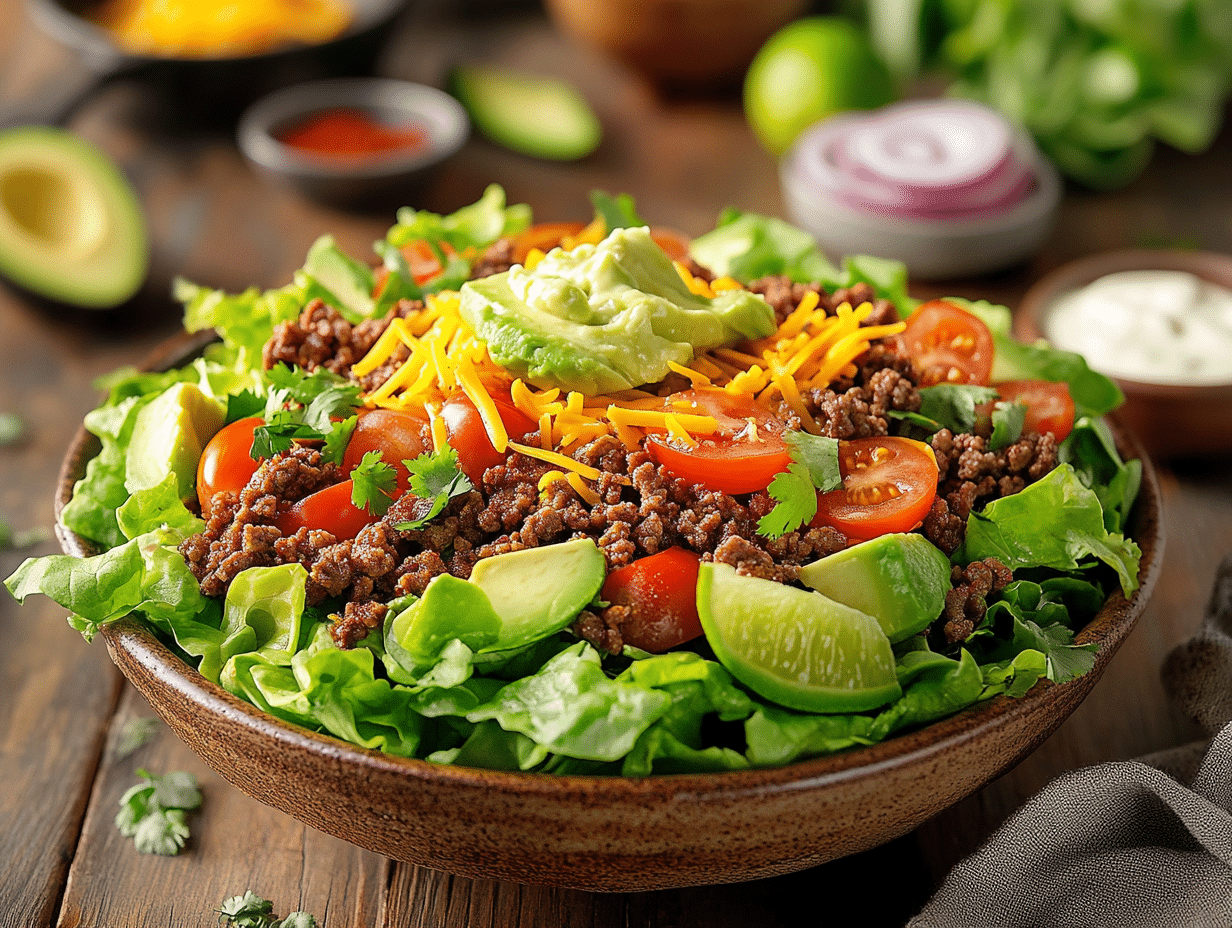 Taco salad is a beloved branch of Tex-Mex cuisine that showcases the rich, bold flavors of traditional tacos while embracing the colorful, fresh elements of a well-balanced salad. Our Low Carb Taco Salad recipe was created to provide all the zest and satisfaction of a classic taco dinner โ smoky, spiced ground beef, creamy avocado, sharp cheddar cheese, and tangy lime crema โ without the carb-heavy shells or tortillas. Whether youโre following a ketogenic diet, reducing your carbs for health reasons, or just looking for a lighter alternative to taco night, this dish offers a vibrant, satisfying option without compromising on flavor or texture.