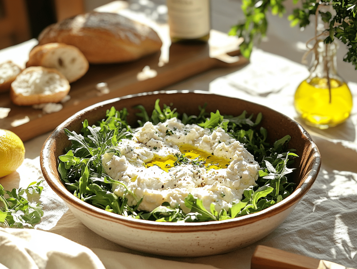 The addition of baby arugula lends a peppery freshness, balancing the richness of the ricotta and the assertiveness of the olives. Arugula has a long-standing presence in Italian cuisine, often used to complement robust flavors. The salad dressing is deliberately minimal—a lively mix of freshly squeezed lemon juice, extra virgin olive oil, sea salt, and black pepper. This unassuming dressing speaks to Calabria’s ethos of letting each ingredient shine without unnecessary embellishments. Calabria’s olive oil, often regarded as some of the finest in Italy, plays a starring role here, elevating the dish with its fruity and slightly peppery undertones.