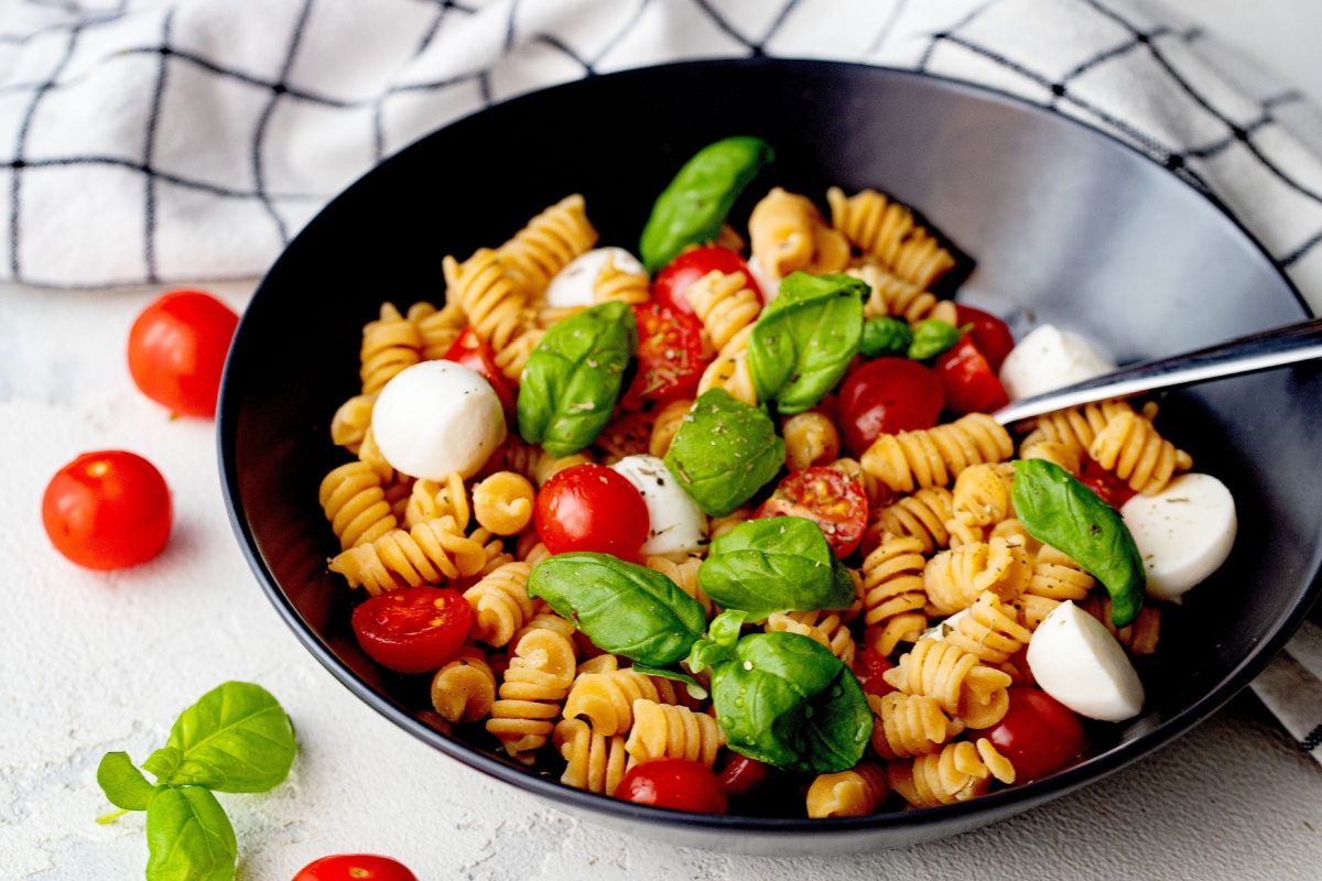 - Combine the cooked pasta, cherry tomatoes, mozzarella, and basil in a large bowl.