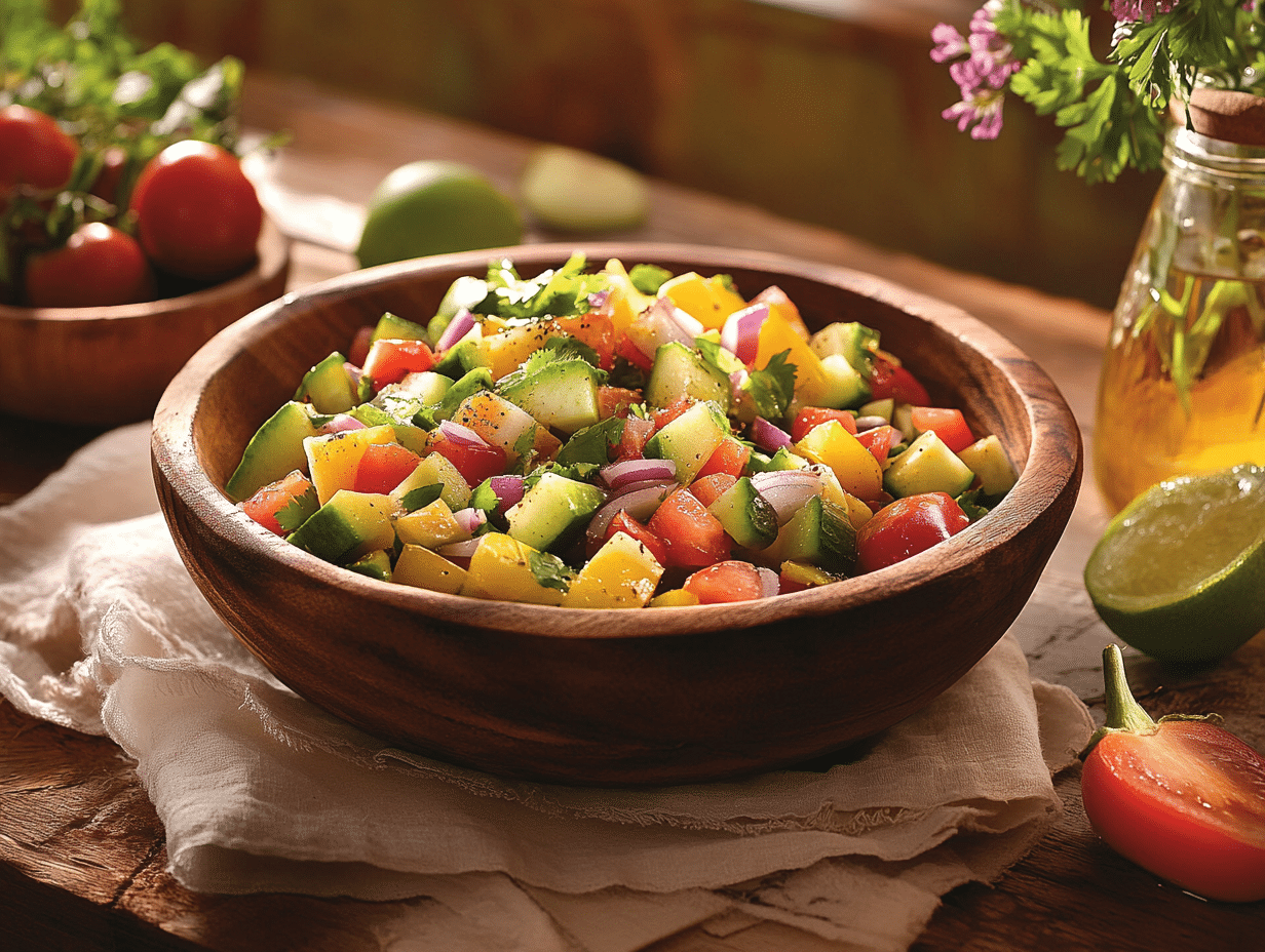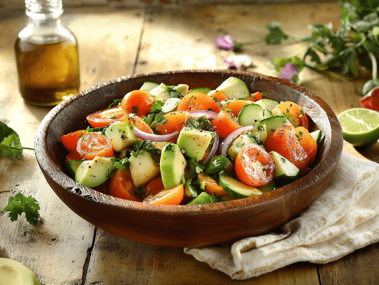 Colombian cuisine is a reflection of its diverse geography, which includes coastal regions, mountains, rainforests, and plains, each influencing the ingredients and cooking styles of the region. Vegetables like tomatoes, cucumbers, peppers, avocados, and herbs, all of which are key components of this salad, thrive in Colombia’s fertile soil and temperate climate. The Colombian Ensalada de Verduras celebrates this abundance by combining these vegetables into a colorful, nutrient-rich dish that is both refreshing and satisfying.
