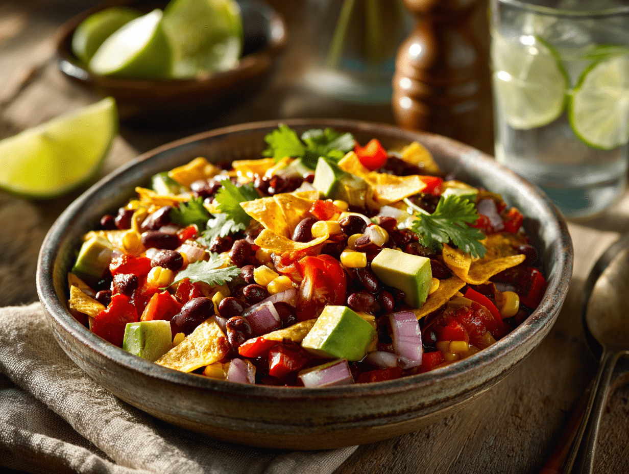 The heart of the dish is its duo of beans – black and pinto – both staples of Mexican kitchens and long-revered for their protein content and creamy texture. When tossed with a bold, warm enchilada-style dressing, the beans absorb layers of smoky spice and tang, delivering a mouthfeel that’s hearty enough for a main meal, yet brightened by a medley of vegetables and finishing touches.