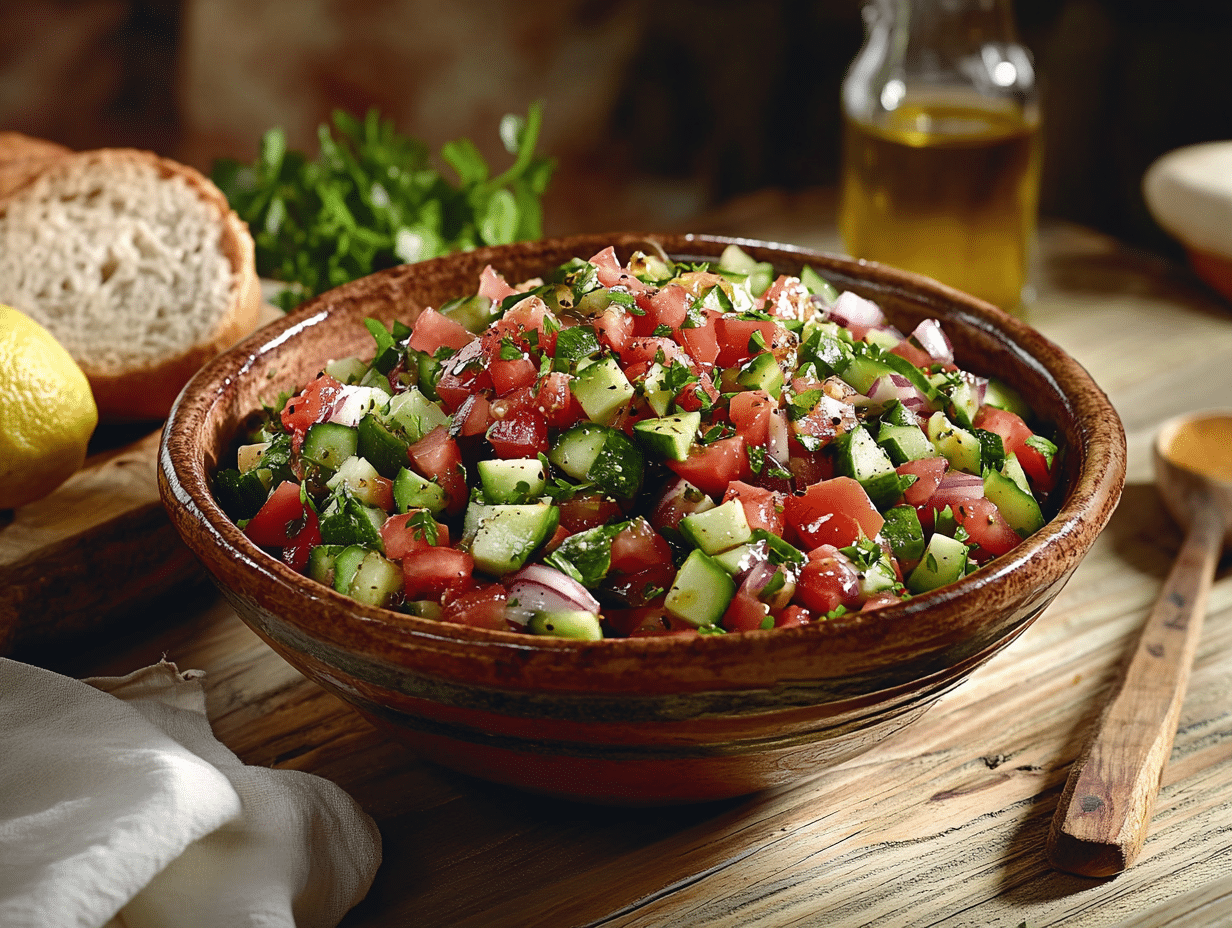 Turkish Shepherd’s Salad is an excellent example of the Mediterranean diet, widely regarded as one of the healthiest in the world. The key components of this dish—ripe tomatoes, crisp cucumbers, aromatic parsley, and tangy lemon juice—are all bursting with vitamins and antioxidants. Topped with a drizzle of high-quality extra virgin olive oil, the salad not only tastes divine but also provides essential healthy fats that promote heart health. For added complexity, powdery red sumac, a tangy Middle Eastern spice, can be sprinkled on top, bringing a refreshing sour note that ties the flavors together.