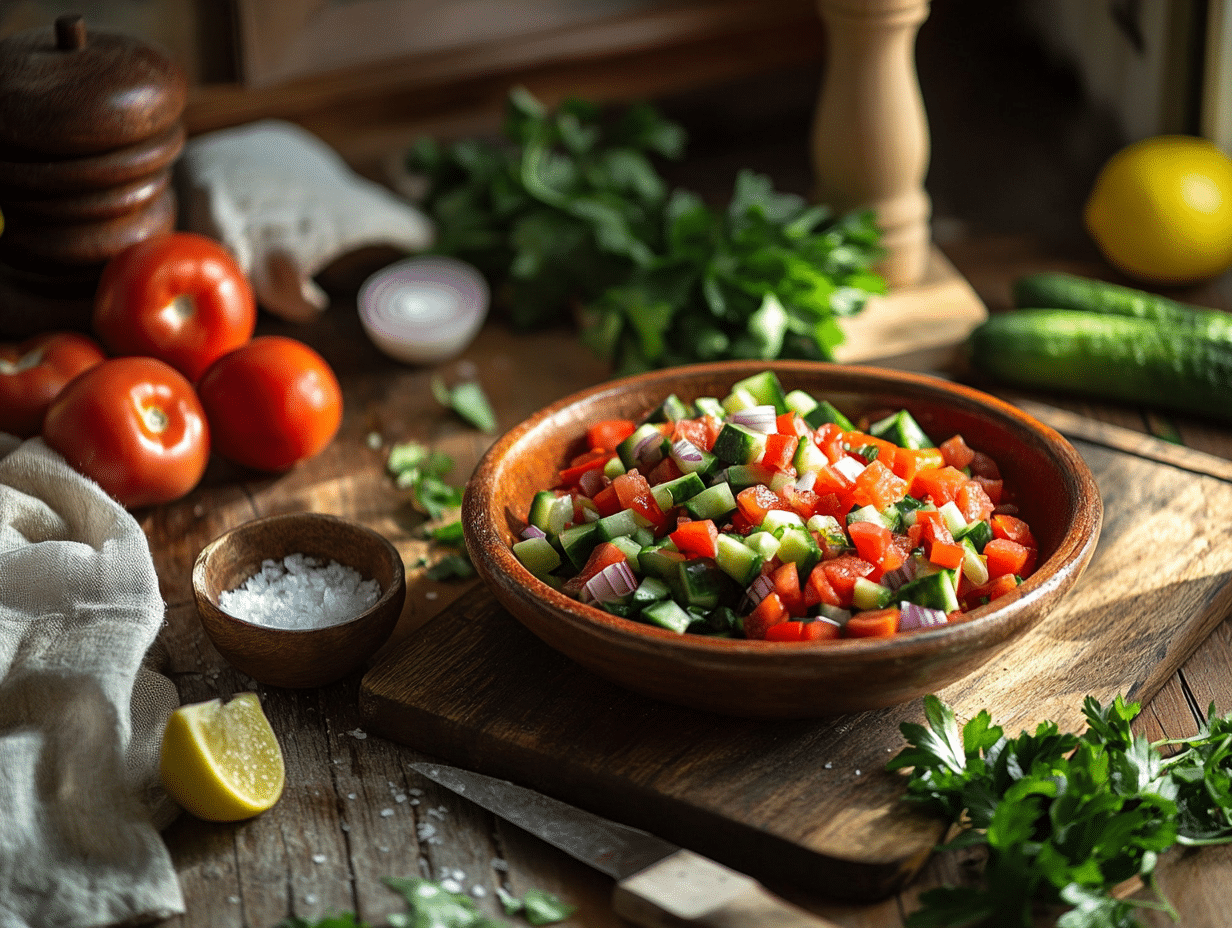 One of the most notable aspects of Salata Baladi is the use of olive oil and lemon juice as a dressing. This pairing is quintessentially Mediterranean, emphasizing the region’s preference for clean and healthy flavors. The olive oil lends richness and smoothness, while the lemon juice provides a bright, tangy contrast. Together, they create a light dressing that enhances the freshness of the vegetables. A sprinkle of freshly chopped parsley adds an aromatic dimension, and simple seasonings like sea salt and black pepper complete the dish.
