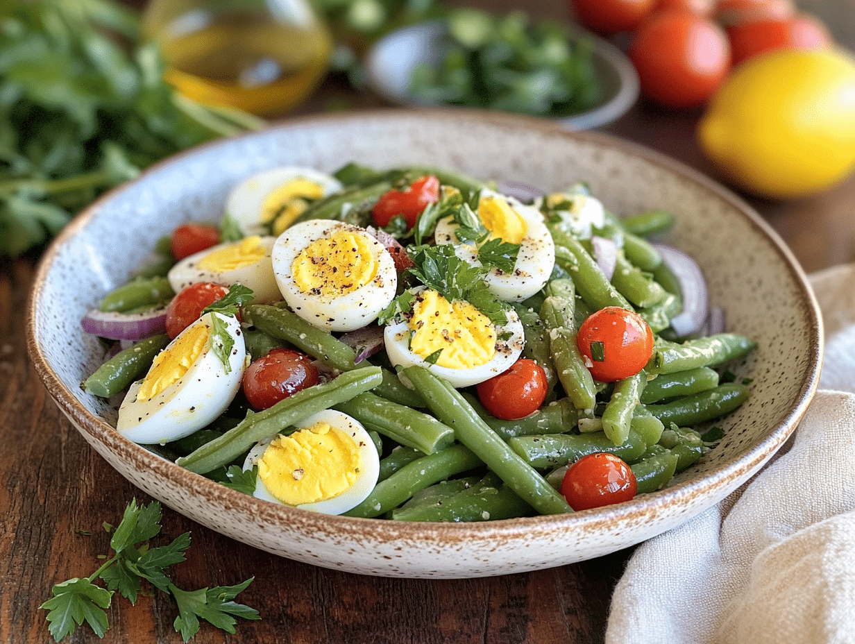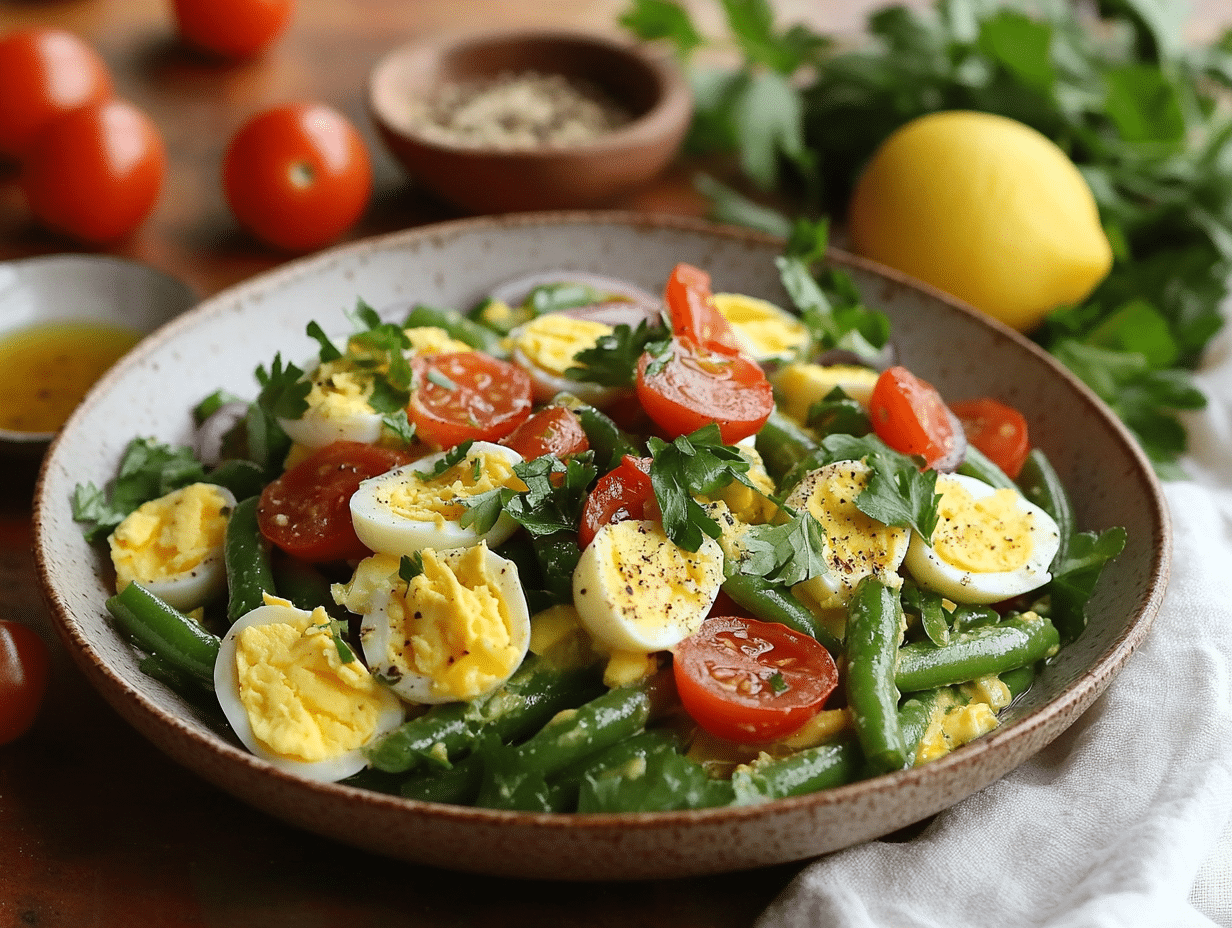 - In a large bowl, combine the steamed green beans, cherry tomatoes, and red onion. Pour the dressing over the salad, tossing gently to ensure even coating. Carefully add the quartered eggs, mixing delicately to avoid breaking them.