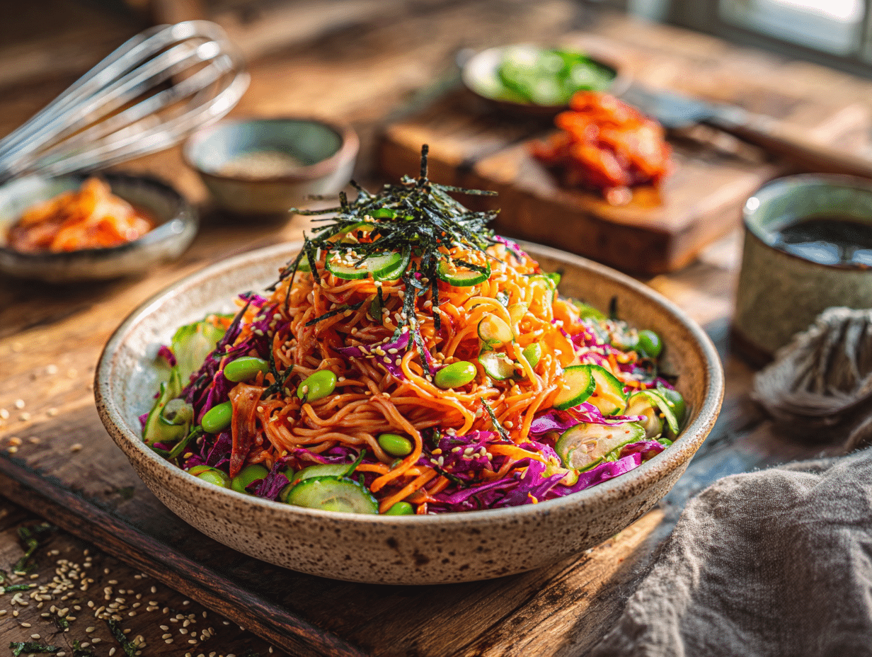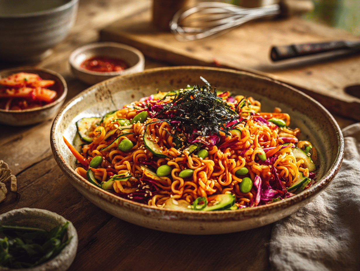 Korean Kimchi Ramen Salad is, all at once, a casual comfort food, a tribute to fermentation history, and a balanced one-bowl meal. It’s nostalgic yet modern, spicy yet cooling, and boldly Korean while inviting creative interpretation. Whether served at a breezy summer picnic or savored during a desk-side lunch, this dish celebrates the ingenuity of Korean home cooking—where pantry staples are reimagined in ways that surprise and satisfy.