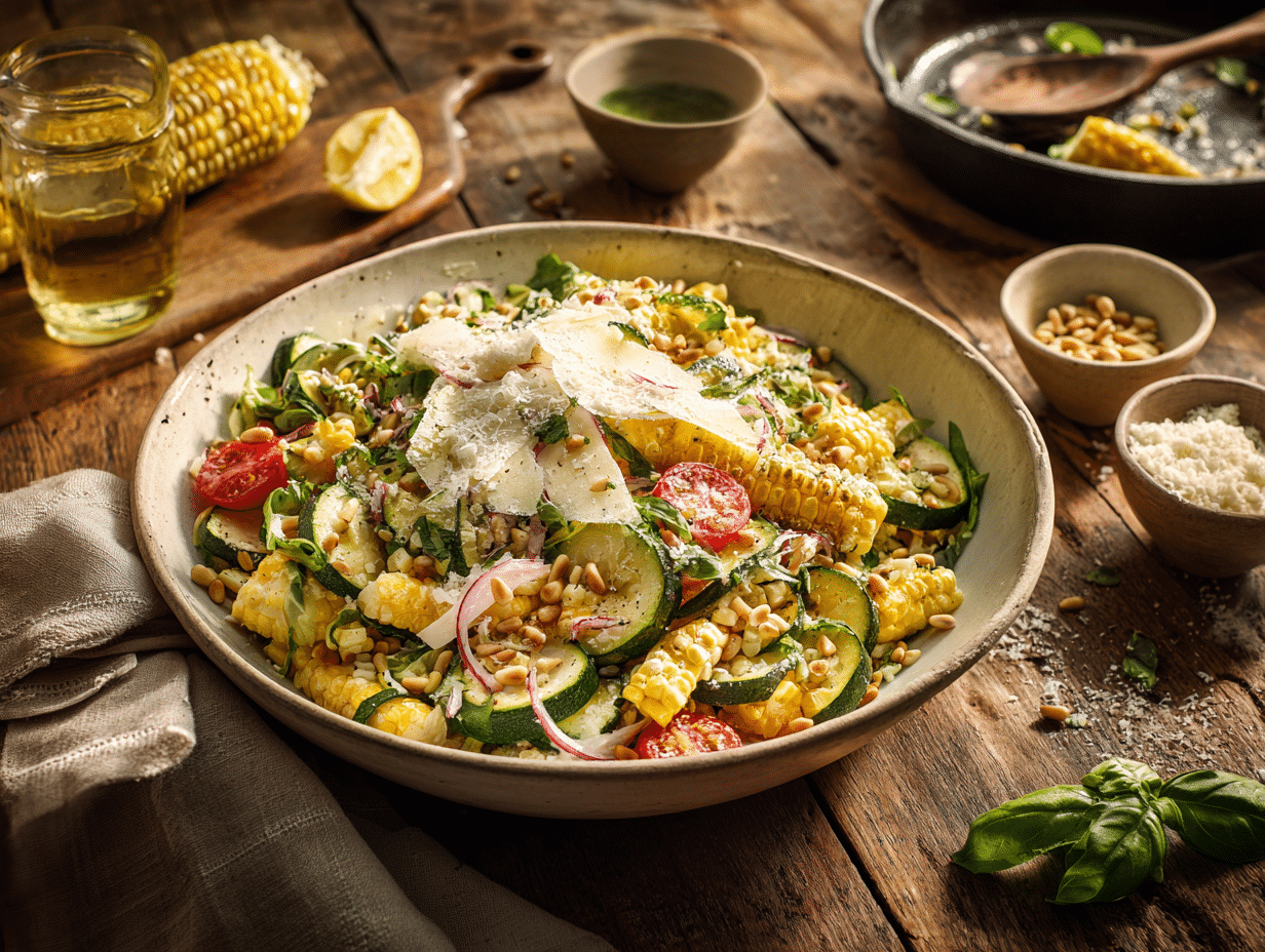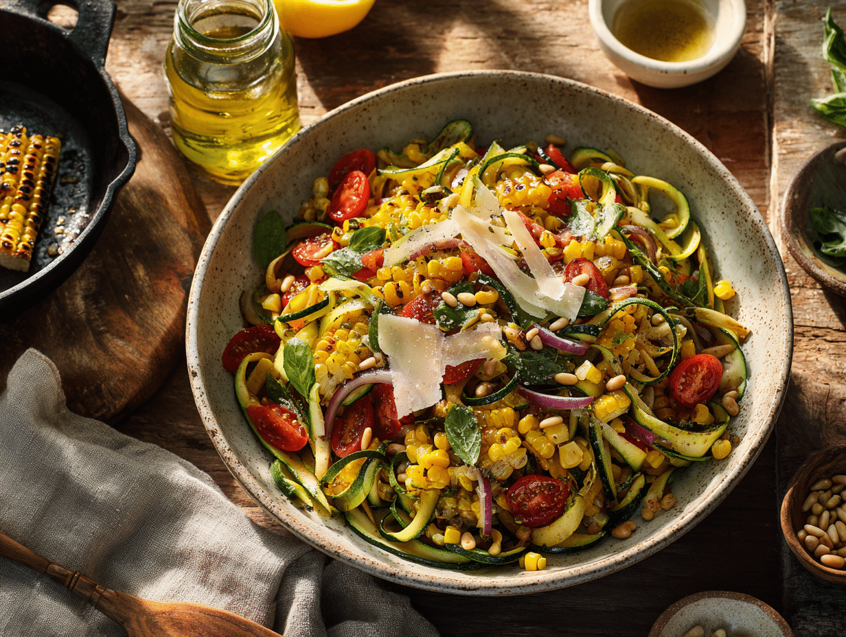 The heart of the salad lies in a pairing longtime farmers’ market devotees know well: corn and zucchini. Corn, when lightly blistered in a cast-iron skillet or grilled, takes on a smoky caramelization that intensifies its natural sugars. Zucchini, by contrast, brings a gentle crispness and mellow earthiness. Instead of cooking it, I ribbon it thin so it folds through the salad like wide noodles—cool, silky, and able to soak up vinaigrette while retaining its freshness.