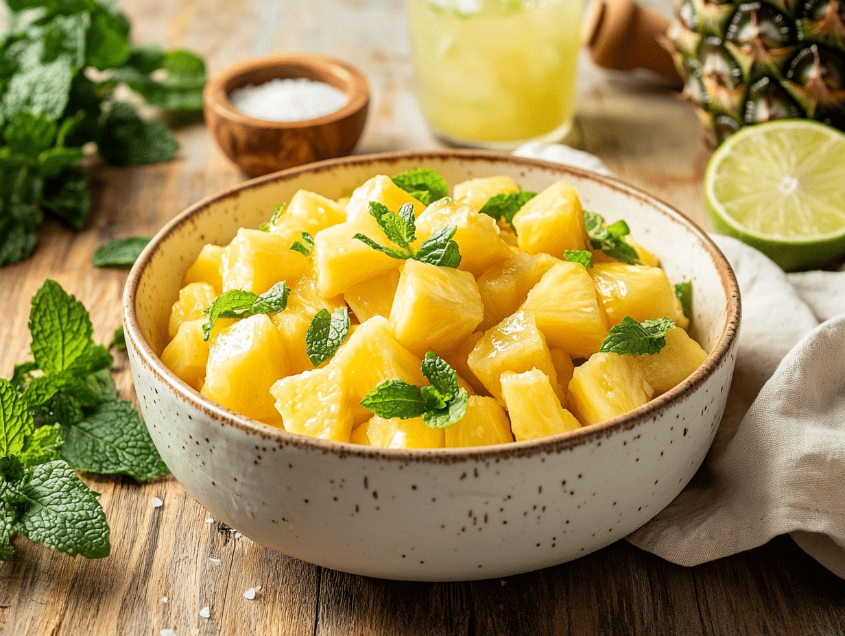 Additionally, the recipe nods to Brazil’s love for incorporating freshness into meals. Mint, a staple herb in Brazilian gardens, adds a cooling contrast to the pineapple’s juicy sweetness, while lime juice provides a zesty brightness. These elements not only honor the country’s flavors but also highlight its tropical climate and the importance of freshness and simplicity in Brazilian cooking.