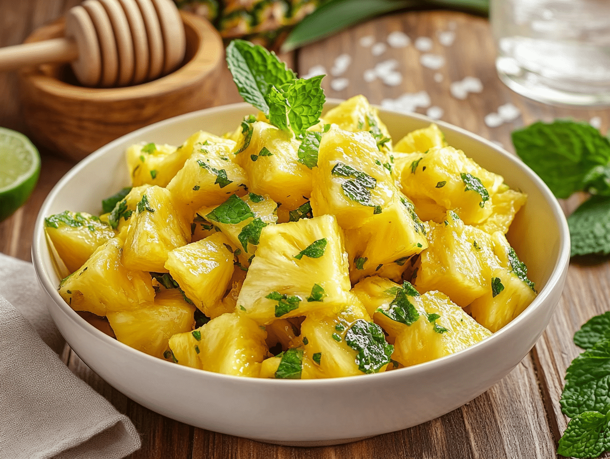 The combination of honey, lime juice, and salt in the dressing is key to the salad’s success. While pineapple and mint are already a winning match thanks to their freshness, the dressing elevates the dish, pulling together contrasting flavors that harmonize on the palate. Lime juice keeps the salad lively, honey enhances the pineapple’s natural sweetness, and sea salt accentuates both flavors while adding a hint of sophistication.