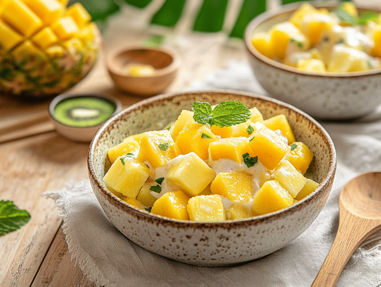 Colombia, located at the equator, enjoys a year-round tropical climate with a variety of microclimates, making it one of the most biodiverse places in the world. The country boasts an impressive array of fresh, seasonal fruits, many of which make their way into its fruit salads. Pineapple, mango, papaya, and kiwi—just some of the fruits featured in this recipe—are commonly grown and enjoyed across the country. These fruits are celebrated for their vivid colors, tender textures, and sweet, tangy flavors, which pair harmoniously in this dish.