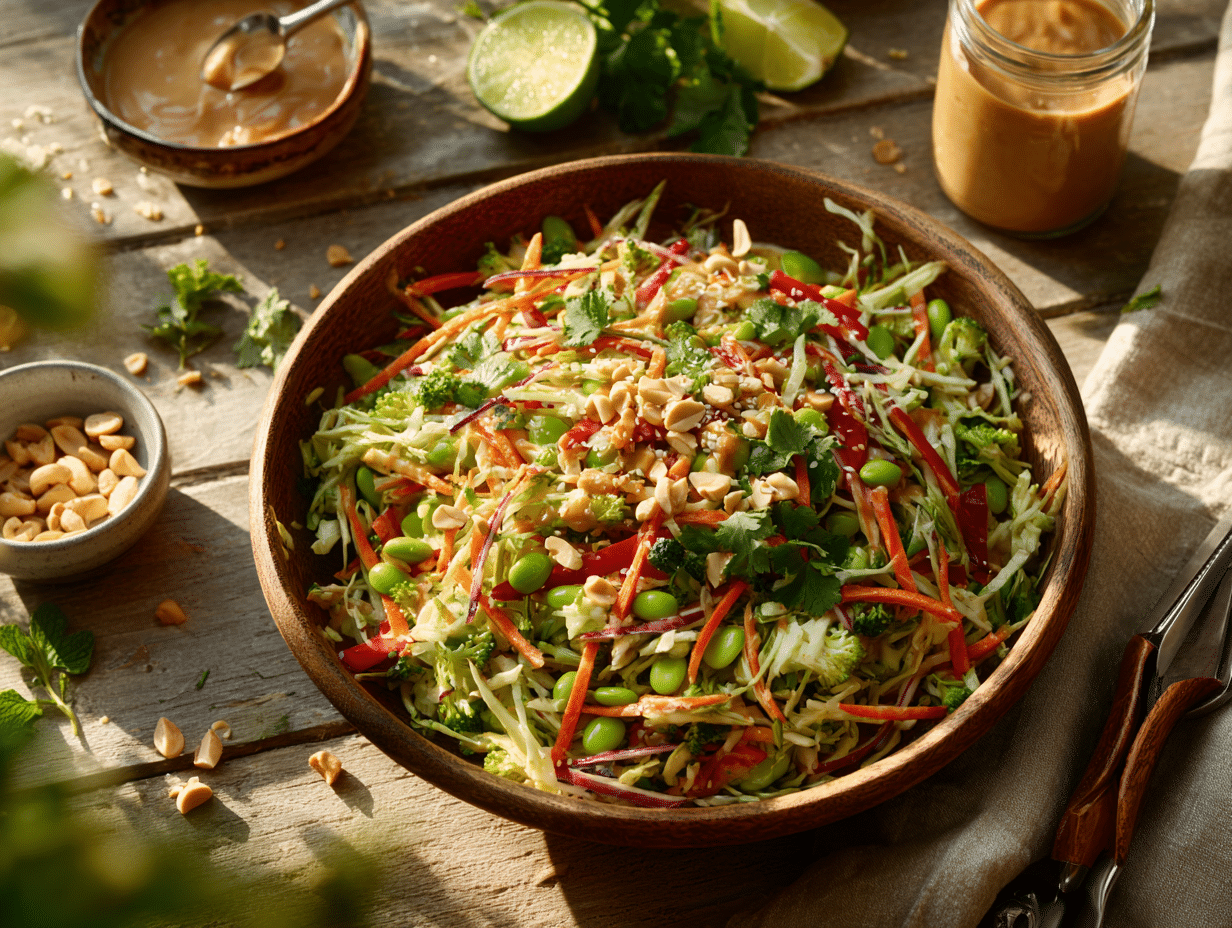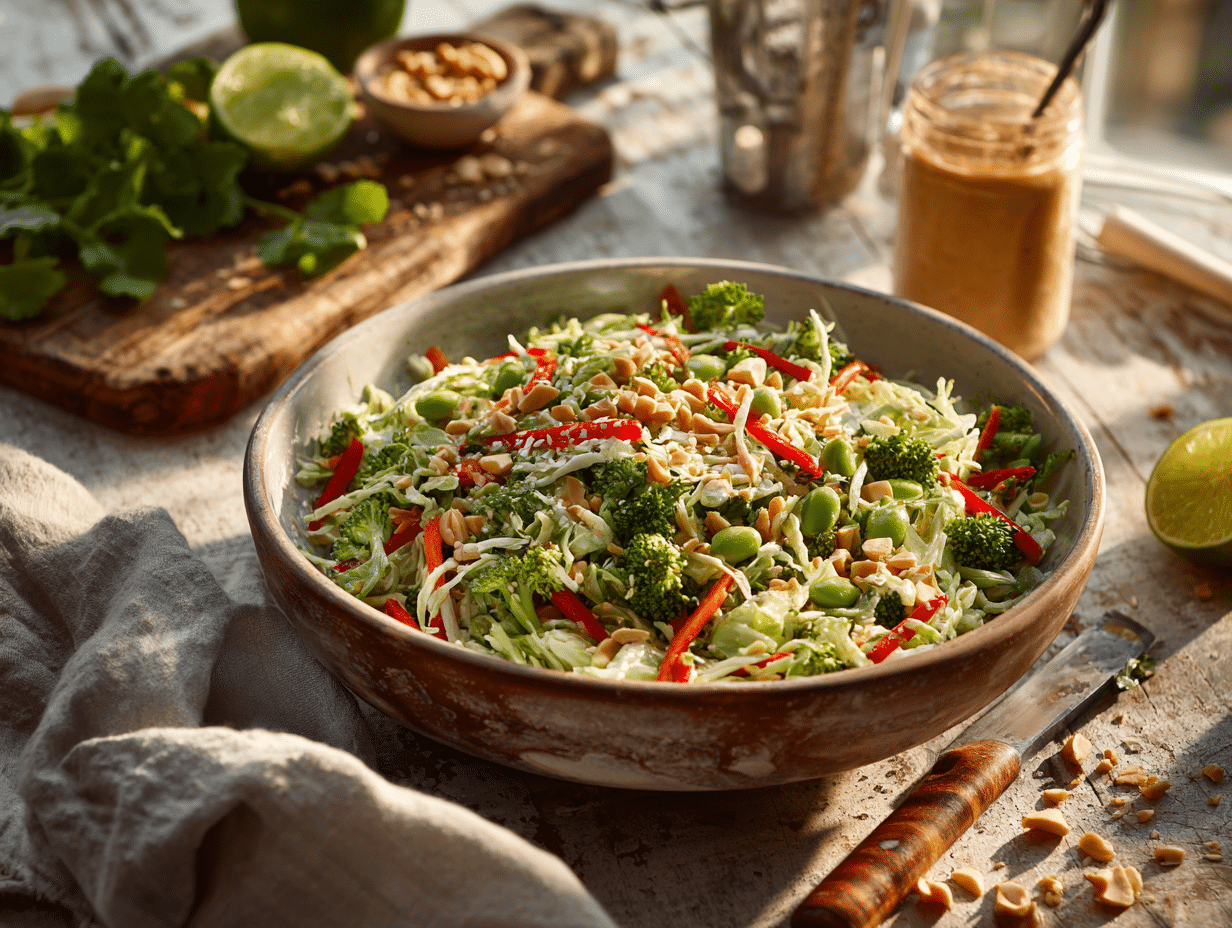 Broccoli Slaw with Peanut Ginger Dressing is a vibrant, texture-rich salad that brings together the crunch of fresh vegetables with the bold, nuanced flavors of Southeast Asia. This dish was inspired by the beloved American broccoli slaw often seen at neighborhood gatherings and potlucks—a nod to nostalgia—but it takes a refreshing detour by swapping the traditional creamy, mayo-laden dressing for a Thai-inspired peanut-ginger vinaigrette. The result is a salad that is lighter, fresher, and packed with character.