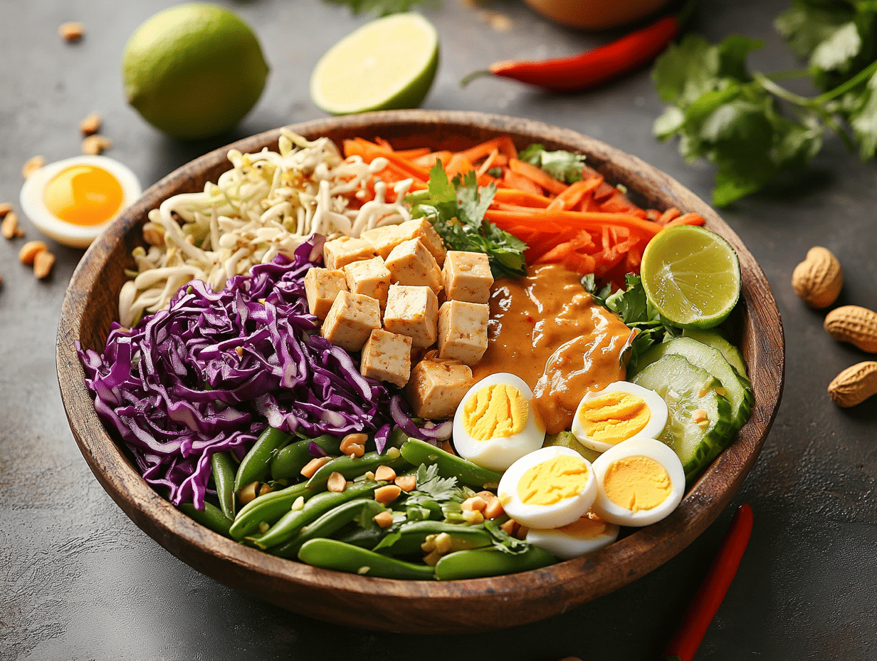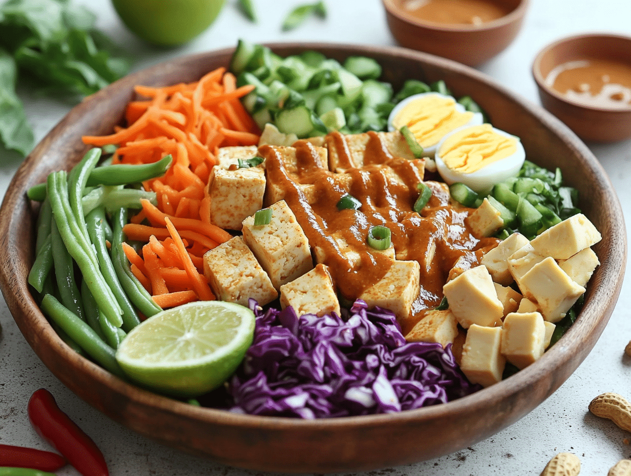 - Assemble the Salad: In a large serving bowl, arrange the blanched green beans and carrots with 2 cups of thinly sliced red cabbage, 1 cup of fresh bean sprouts, fried tofu cubes, and halved hard-boiled eggs. Drizzle generously with the prepared peanut sauce.