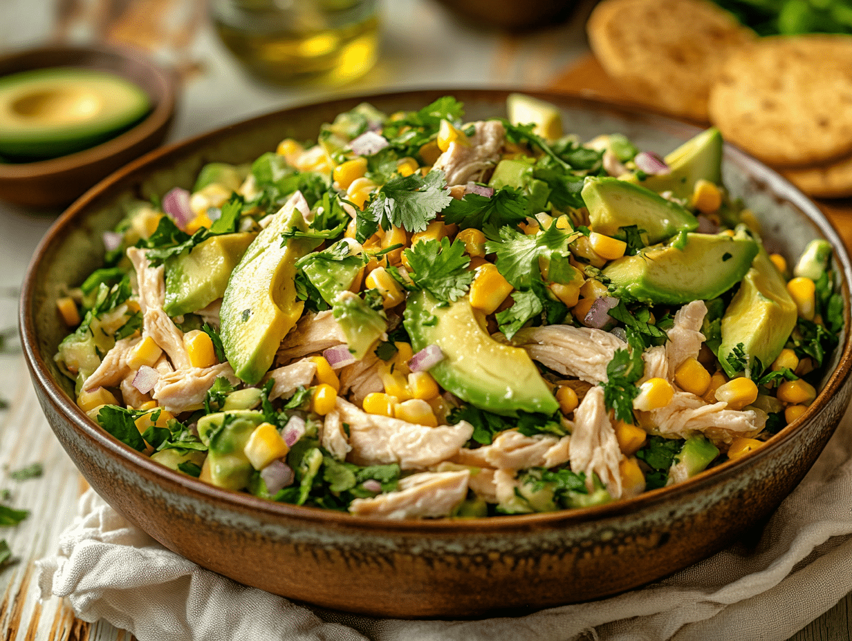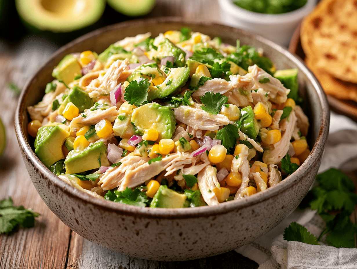 - In a large mixing bowl, combine the shredded chicken and diced avocados. Gently fold together to prevent the avocados from mashing.
