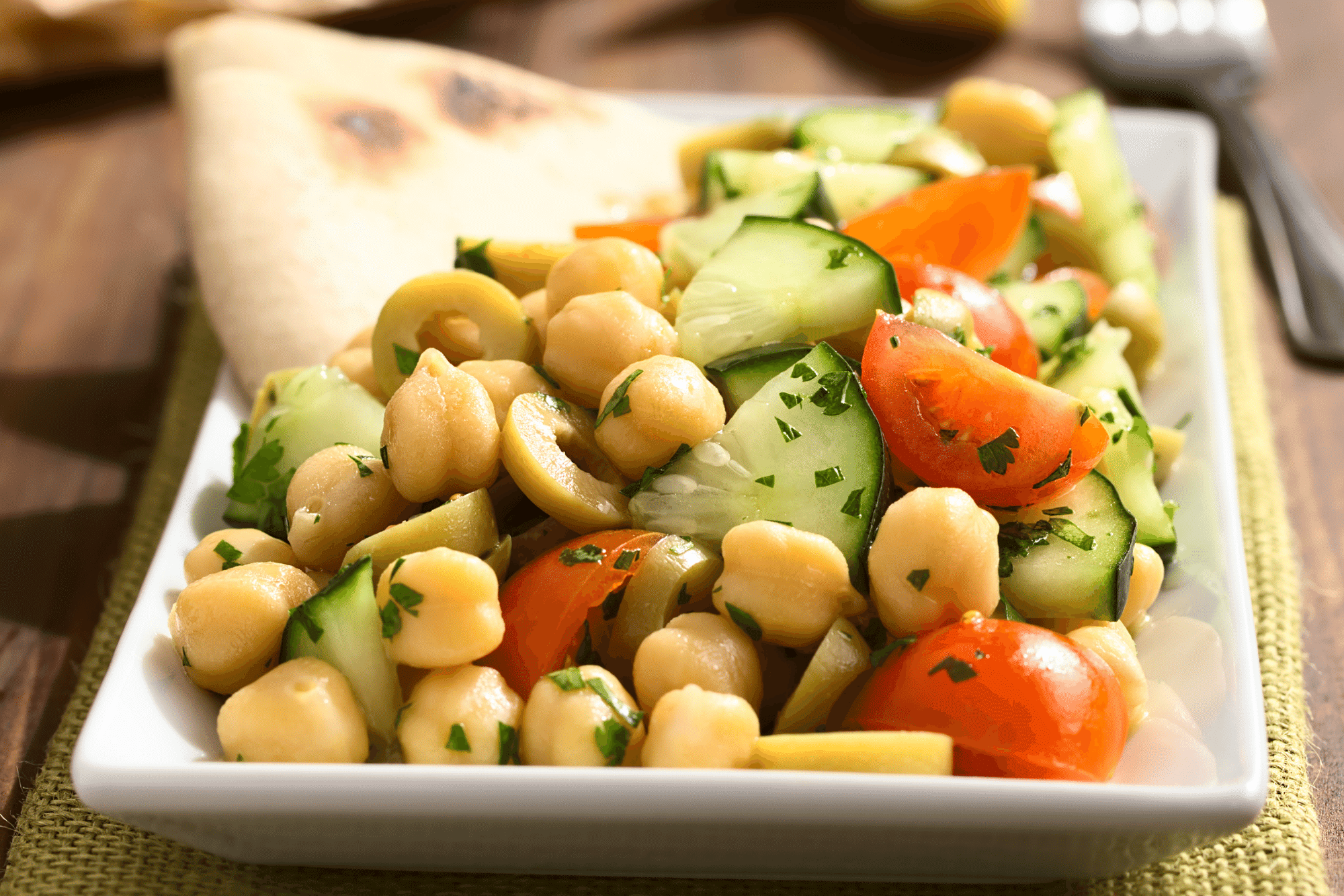 - Drain the chickpeas. Dice up the red onion and cucumber.