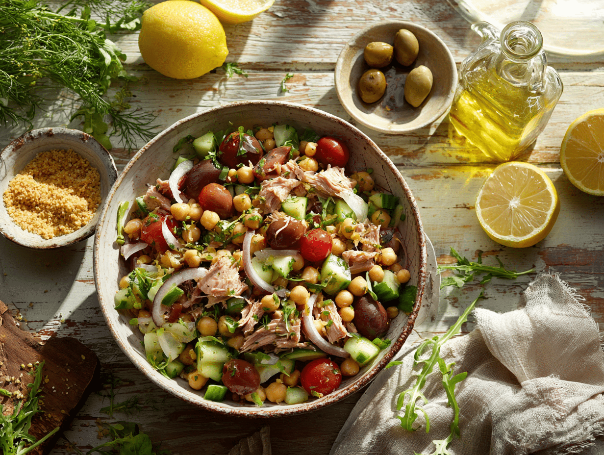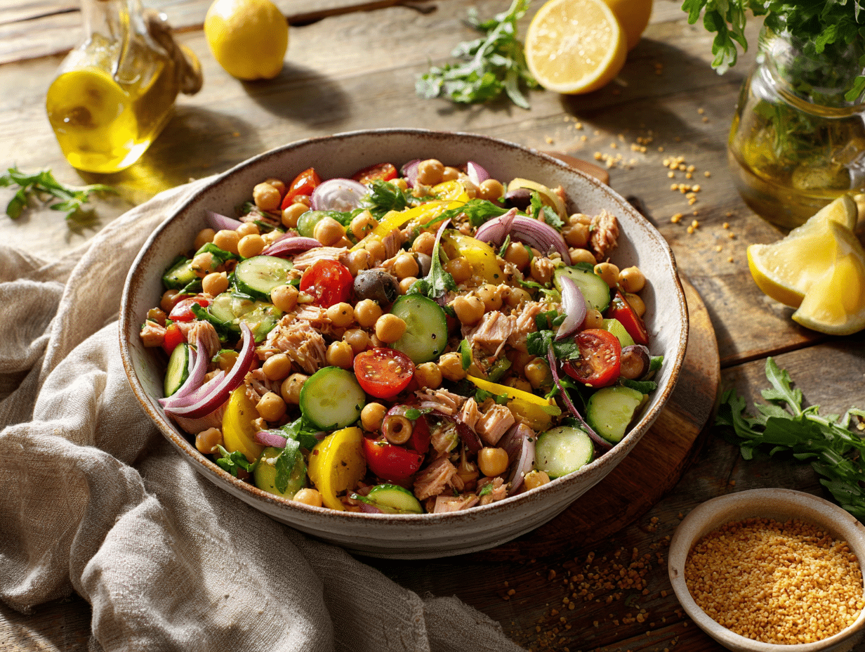 The Chickpea and Tuna Salad with Lemon Vinaigrette pays homage to the rustic elegance of Mediterranean cuisine, where vibrant flavors and wholesome ingredients come together in uncomplicated but deeply satisfying ways. This salad was crafted as a celebration of pantry simplicity elevated by bright seasoning, smart texture, and careful balance, inspired by traditional dishes from Southern Europe, particularly the sun-kissed coasts of Italy and Greece.