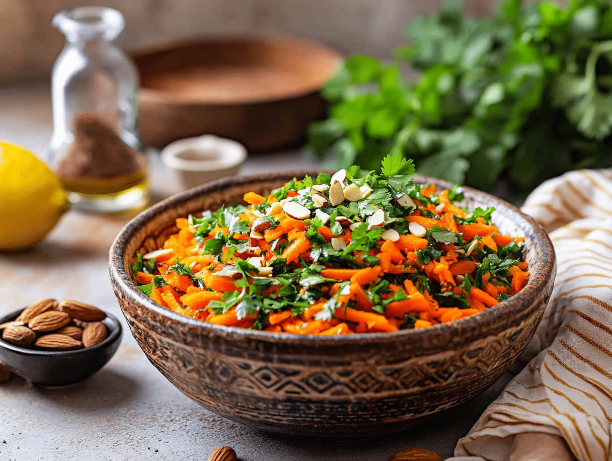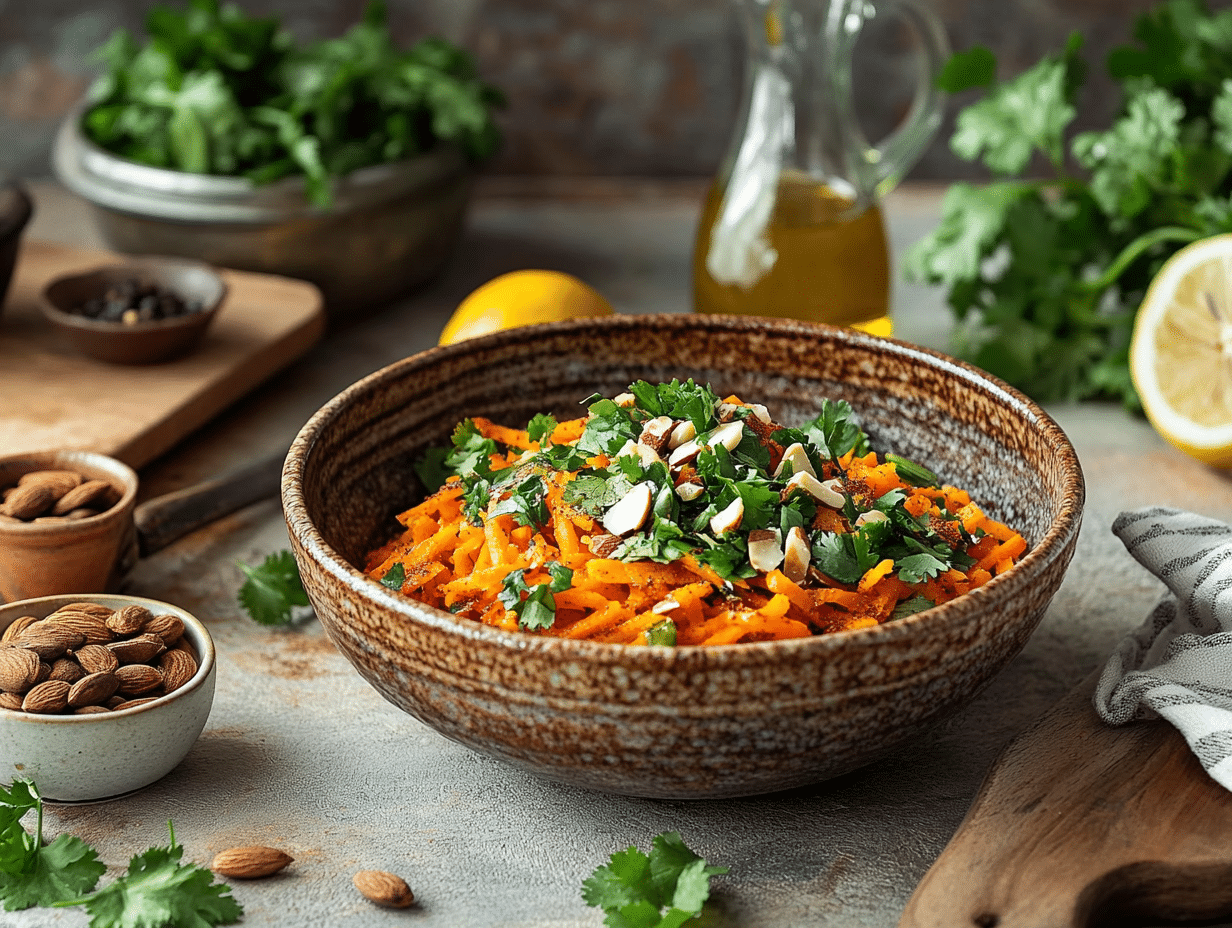 The foundation of this salad is carrots, an everyday vegetable elevated to star status through the skillful use of spices and aromatics. Carrots are renowned for their natural sweetness and crunchy bite, which are complemented beautifully by the golden raisins. Raisins, often used in Moroccan cuisine, add sun-kissed bursts of sweetness and a chewy texture that contrasts with the tender grated carrots. The addition of toasted almonds further builds on this textural play, adding a nutty depth and crunch that ensures every bite remains interesting. Finely chopped red onion carries a subtle sharpness, while fresh cilantro injects the dish with a herby brightness, balancing the salad’s richness.