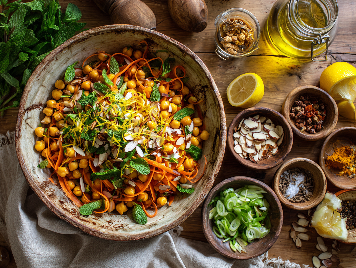 Moroccoโs culinary landscape is distinguished by its intricate layering of flavors and texturesโsavory stews, zesty relishes, and colorful small plates abound. In this recipe, those principles are brought to life in a salad that celebrates balance and contrast. Chickpeas, a pantry staple across the Mediterranean and Middle East, form the protein-rich heart of this dish. Lightly dressed and allowed to marinate, they take on deeper flavor from the warm, oil-bloomed spices while offering a satisfying bite.