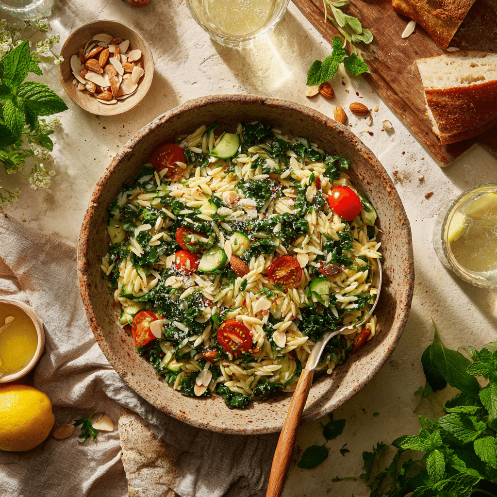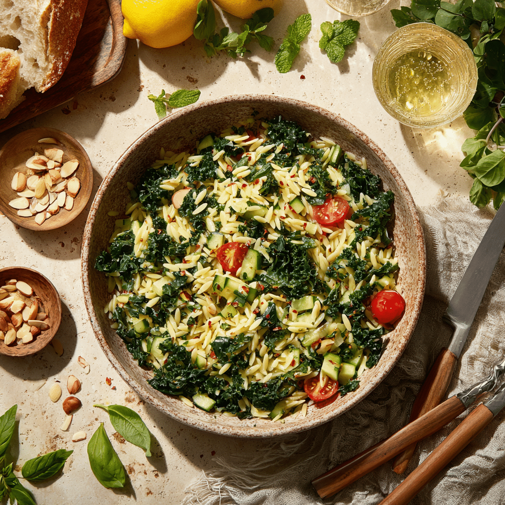 Created with a Mediterranean sensibility and a modern kitchen in mind, Kale & Lemon Orzo Salad is a dish that proves salads can be both soul-satisfying and seasonally smart. Whether packed for a picnic, served at a summer soirée, or enjoyed as a desk lunch, it’s a recipe that reflects balanced, joyful eating—one lemon-laced bite at a time.