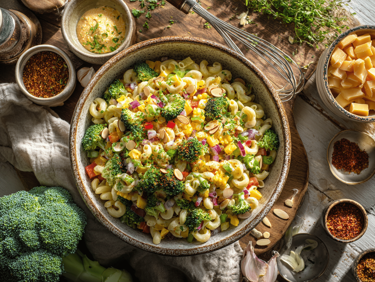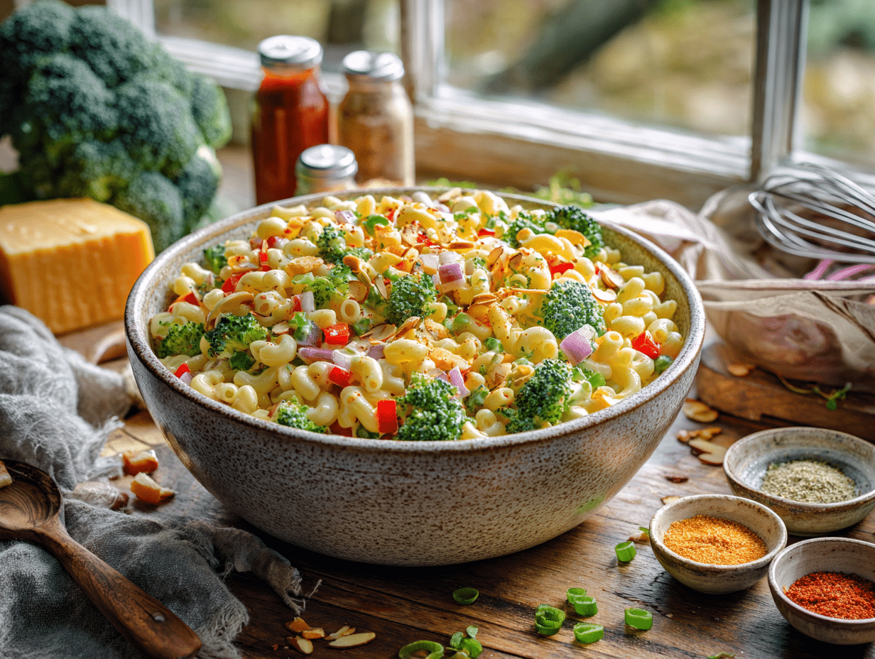 - Combine the Salad: Add cooled macaroni, broccoli, celery, red onion, red bell pepper, scallions, and cheddar cubes to the bowl. Toss gently with a wide spatula until every nook is coated, 1โ2 minutes. Fold in half of the toasted almonds, reserving the rest for garnish.