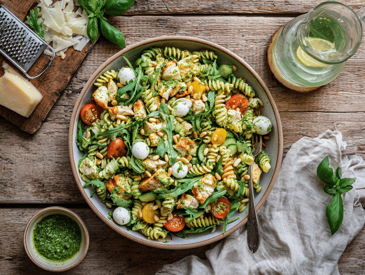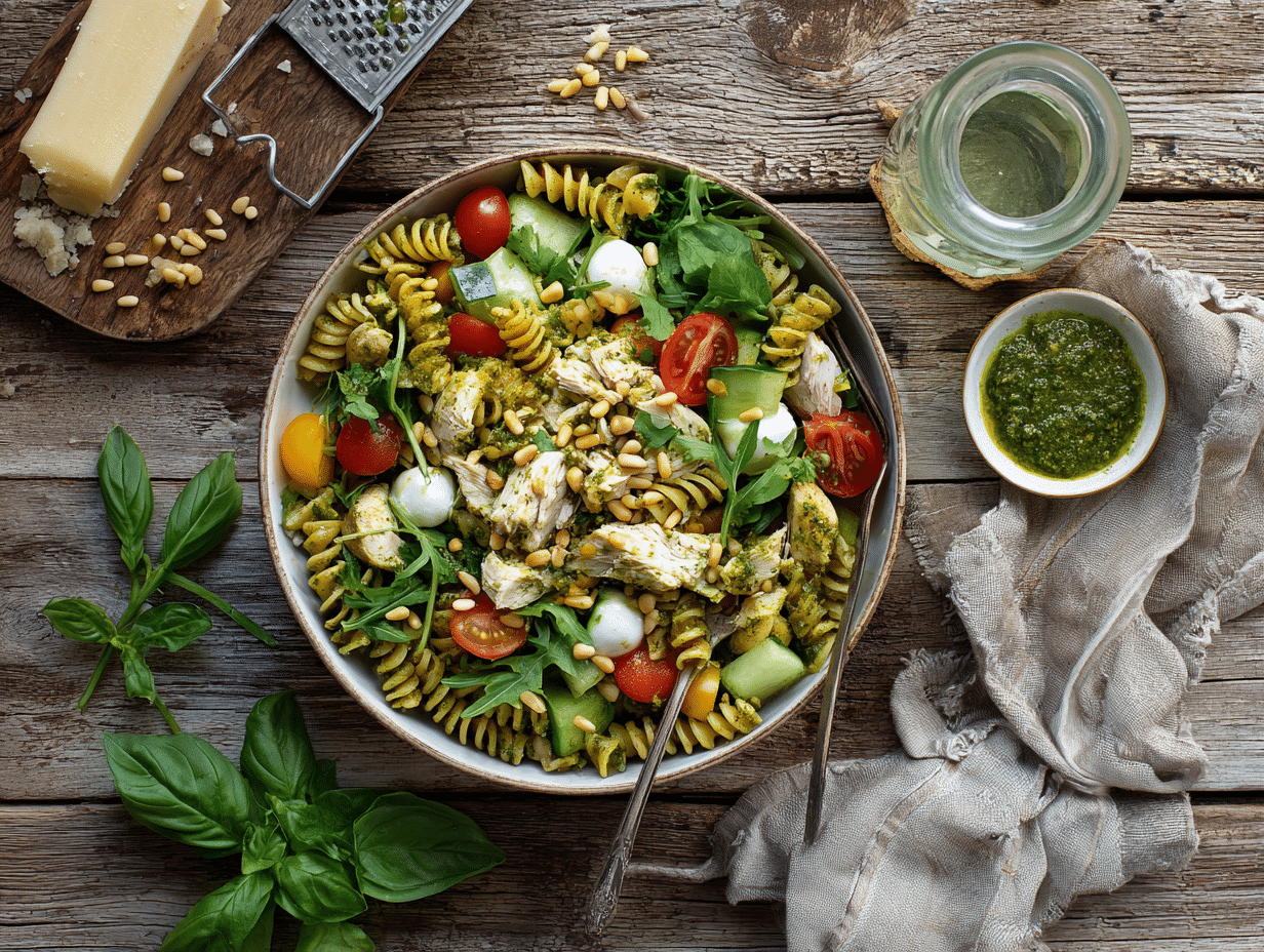 In the interest of mouthfeel and visual variety, this salad includes fresh mozzarella pearls for creaminess, tomatoes for sweetness, cucumber for crunch, and tender arugula for peppery contrast. Toasted pine nuts reappear on top, echoing their flavor in the pesto but adding rustic crunch. Farfalle, rotini, or fusilli pasta serves as the baseโpasta shapes well-suited for catching dressing in their curves and ridges.
