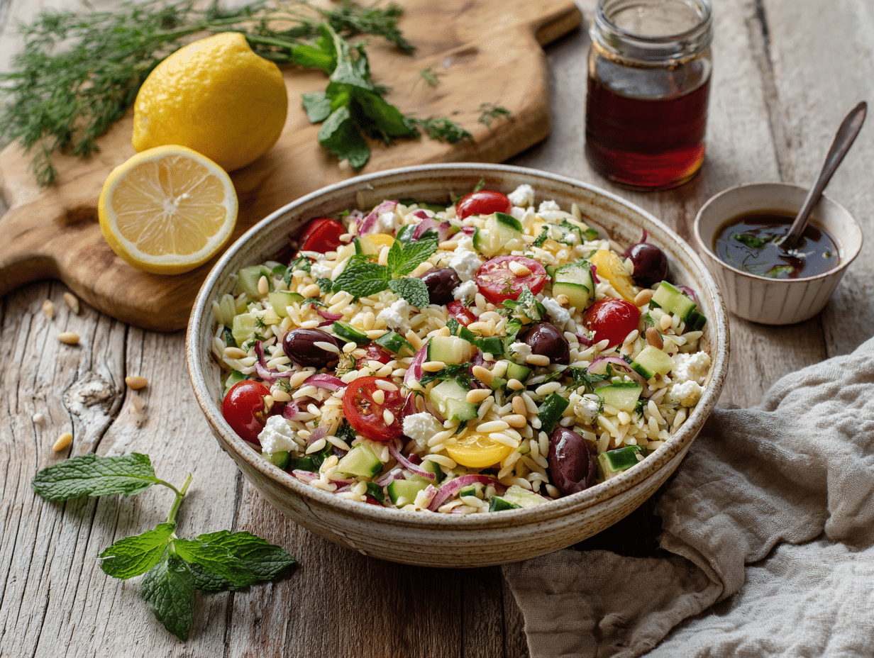 Orzo, a delicate rice-shaped pasta, is a common pantry staple across Southern Europe and the Middle East. While technically pasta, its small size and texture allow it to soak up dressings and juices like a grain, making it a fantastic base for cold salads. In this dish, it replaces leafy greens often used in Greek or Mediterranean salads, offering a heartier, make-ahead-friendly foundation that holds its structure even after refrigeration.