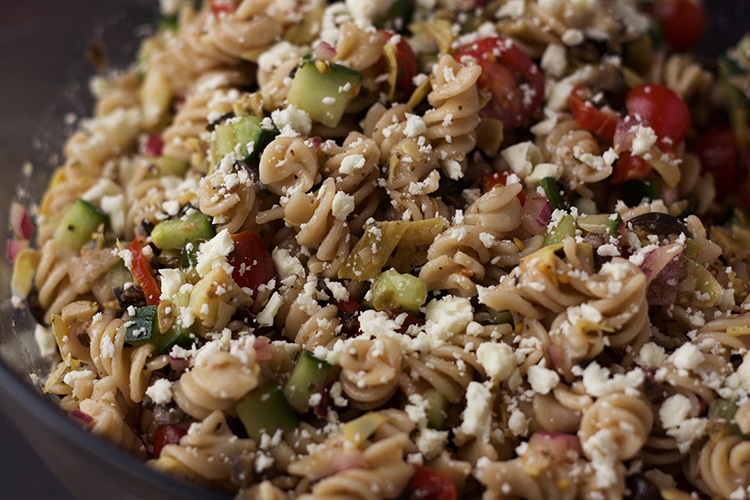 That’s how I view this Mediterranean pasta salad — as flexible. While I did measure to make the recipe, you could add more cucumber, leave out the artichokes, or add fresh parsley. Any of these changes would still produce a delicious result. Hence, my preference for cooking.