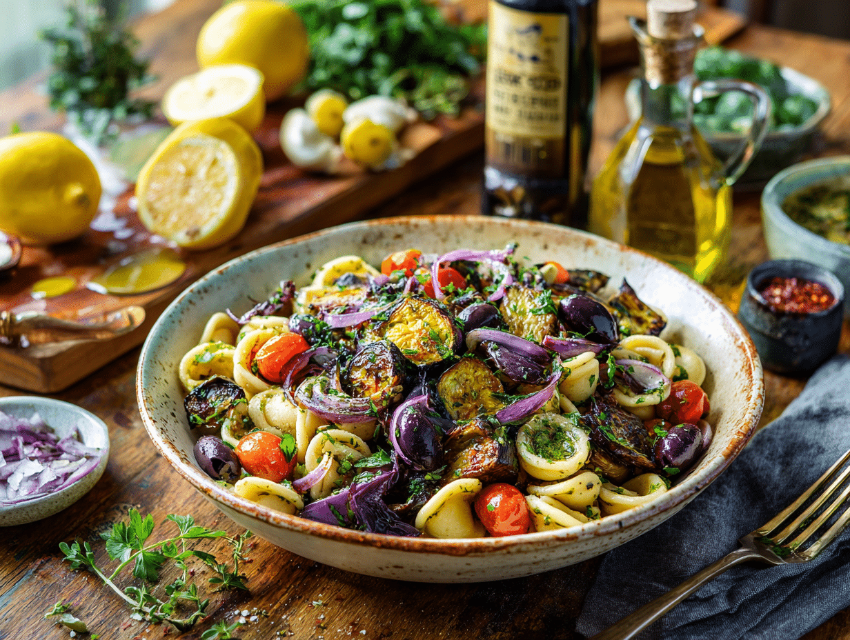 Ultimately, Roasted Eggplant & Olive Orecchiette Salad is a celebration of balance—between softness and crunch, mellow and sharp, rich and light—honoring Puglia’s hearty, olive oil-driven cuisine while creating a versatile, modern dish perfect for any season.