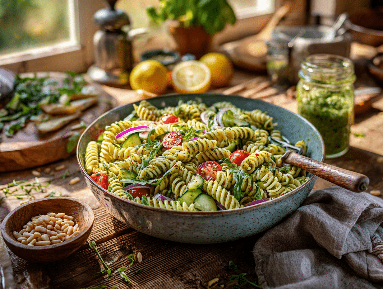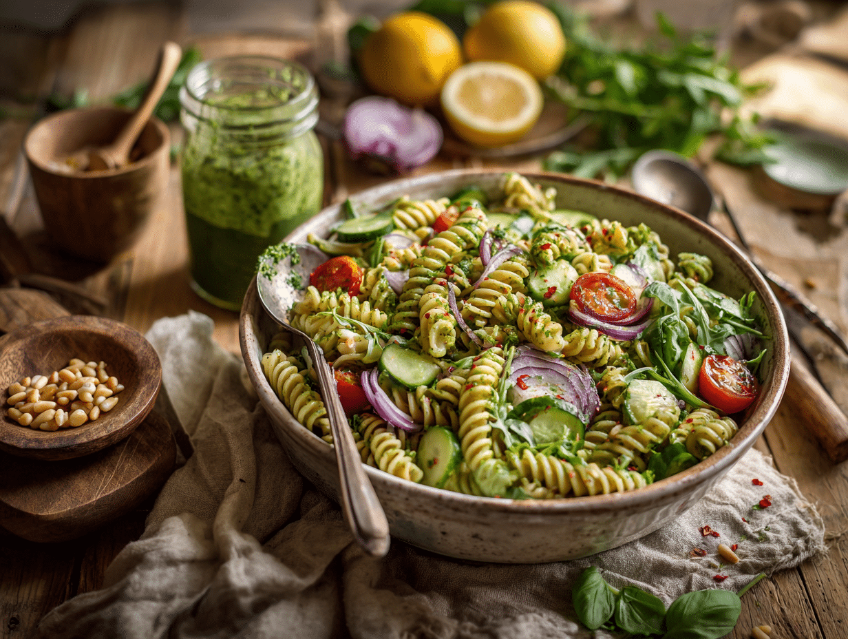 This salad is a celebration of summerโs best produce and a great example of how plant-based cuisine can stand tall beside its traditional counterparts in both taste and integrity. The combination of lemon, herbs, and olive oil transports you to a seaside Italian village with each forkful โ and yet, the simplicity of the method makes it accessible to home cooks of all levels. Whether served slightly chilled from the fridge or at a breezy room temperature, the Vegan Pesto Pasta Salad is more than just a side dish โ itโs summer in a bowl.