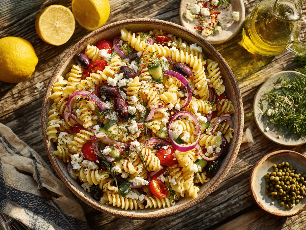 The inspiration for this dish stems from the Aegean coast, where meals are often served outdoors, shared among family and friends, and composed of the freshest local produce. The marriage of pasta and horiatiki-style ingredients makes this salad distinctly Mediterranean yet incredibly accessible for modern cooks. Instead of lettuce or leafy greens, it uses sturdy cooked pasta—typically rotini or fusilli—which absorb the lemony vinaigrette while giving the salad a toothsome texture that holds up well. The spirals of pasta act as flavor catchers, clinging to bits of crumbled feta, chopped herbs, and tangy vinaigrette, ensuring a burst of brightness in every bite.